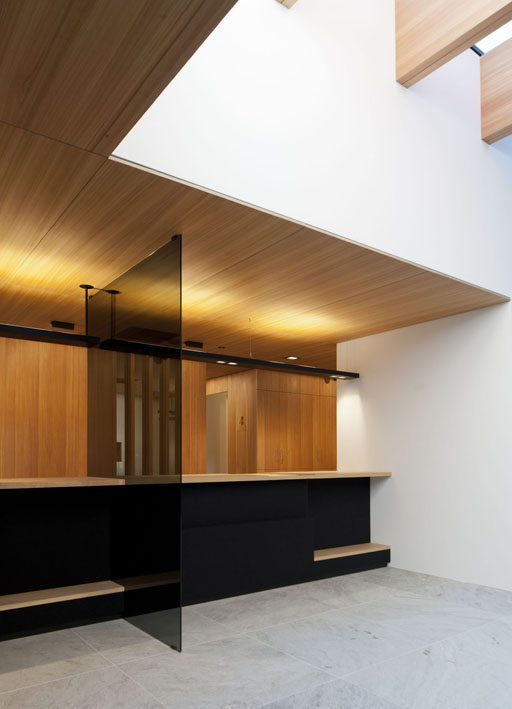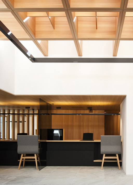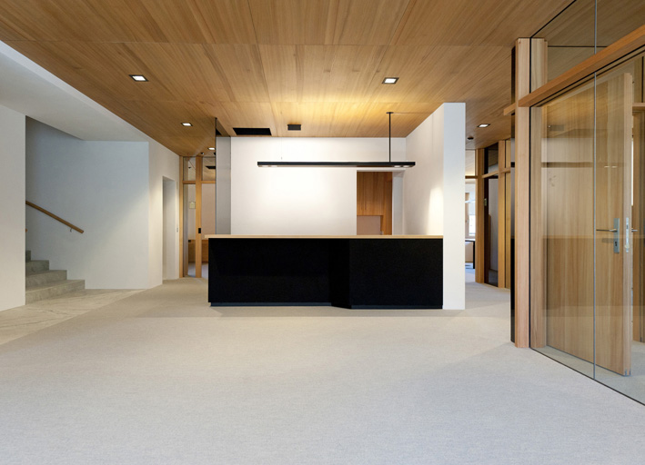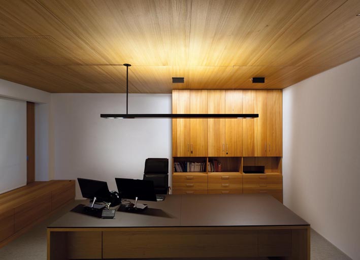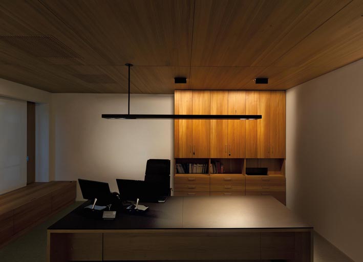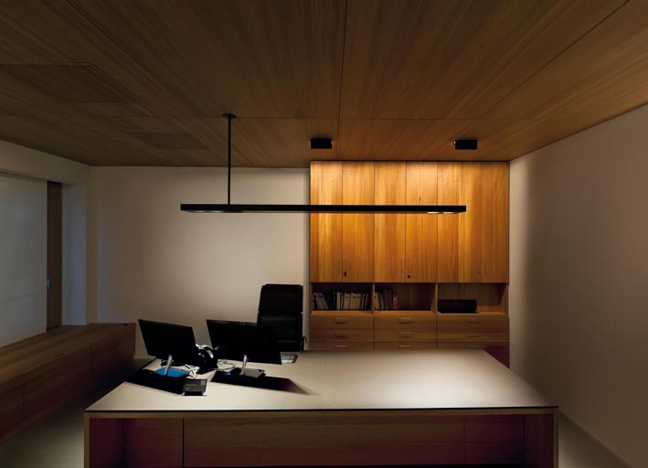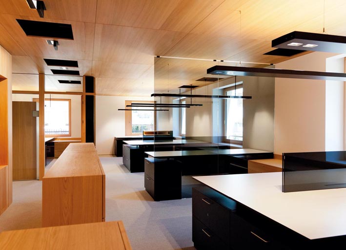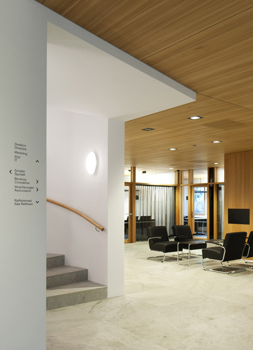 situated in kastelruth historic centre, old village on sciliar plateau in bolzano province, in the heart of dolomites, the new hedquarters of raiffeisen bank harmoniously integrates in the existing context and is characterized by the predominant use of natural materials, such as wood and stone. the spaces lighting has been conceived from an ergonomic point of view, with a high level of individual control on the atmosphere one wants to create with light. the form, the expression, radiation characteristics and design of the lighting system, as a whole, is reduced to three elements: workplace lighting, traffic zones lighting and stairwell lighting. the working atmosphere for employees and clients has been designed with a particular attention. the c208 light fittings are adjusted on a formally self-effacing beam, parallel to the workplace, at a height of approximately 2.10 metres, with an indirect component with fluorescent lamps and direct led inserts (10W, colour rendering higher than 90%, with asymmetric radiation reflector technology). the direct component of light can be adjusted directly by employees, according to individual sensibility or task to perform. in this way, light can generate different intensity levels depending on the work situation on any desk. in the screen area, the light intensity can be adjusted lower than in the table area using conventional or communication equipment – individually and continuously. with this, each user can set his/her own space: more or less indirect light, more or less direct light, more or less light to the right or to the left. the reflectors of the direct components are set in order to prevent the employees not to be directly illuminated: this means more visual comfort without any light intensity and so a relaxing working atmosphere. the traffic zones are equipped with wallwasher lights and recessed fittings with downlight source. for the staircase it has been designed a glass lamp that shows its crystalline structure as a particular feature, so the led light is diffused and reflected in a specific way. in conclusion, thanks to a careful design, light gives personality to each workplace, improving its atmosphere, and at the same time it seems to expand the already-wide spaces, example of modern architecture in a historic context.