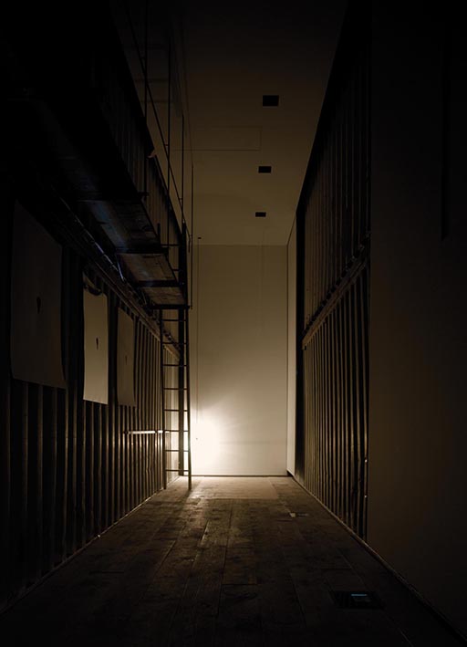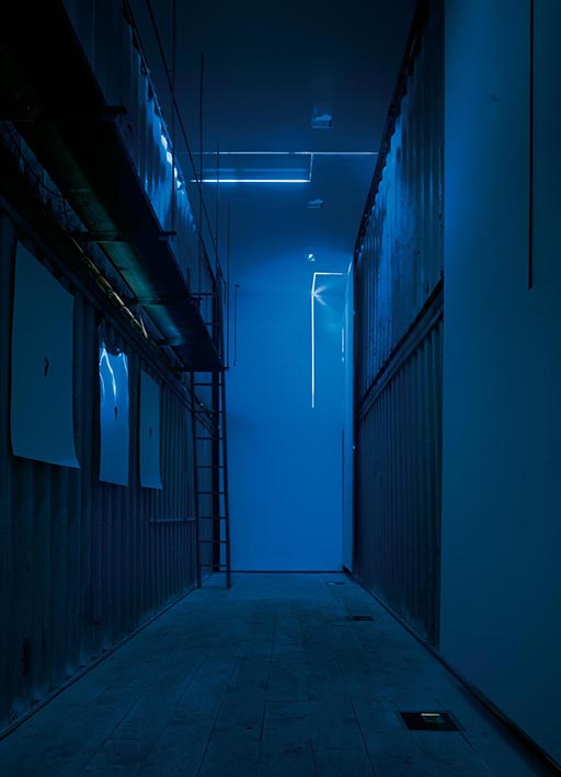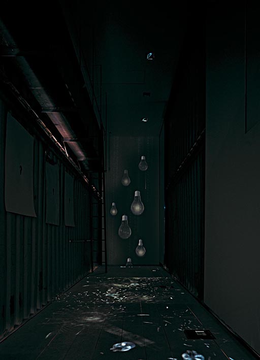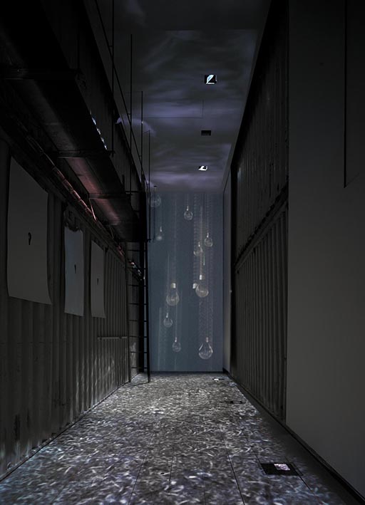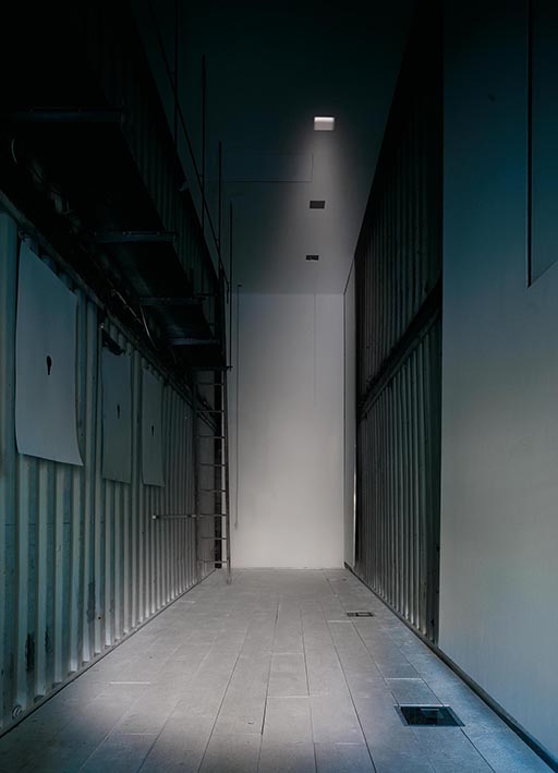 light comes in in an instant and shadow announces it, increasing slowly in front of it: the first moving light which the visitor perceives in this place is his own shadow. the eye is still sensitive to sunlight, still occupied by the image of a shadow projected on the ground, when slowly it begins to perceive the shapes of space in the half-light. only the presence of a trapdoor lets in carefully measured natural light which puts the place in focus. two containers placed one on another to create a two-storey environment, strongly vertical and developed lengthwise with regard to the entrance. the mezzanine positioned over the entrance compresses the space and makes it more cosy, but the eye travels beyond it and rests at the far end, on the high corner of the structure. it is there that the edison light bulb has been positioned (3). from this light bulb comes the modern history of light. its invention was the beginning of the end: the end of the ability and the willingness to design with natural light, studying it, shaping it, observing it; it became more convenient to position a number of light sources rather than designing with light, treating light as a material (4). the light bulb at the end of the room rises slowly, winding up its cable, and as it rises it becomes fainter: here begins the spectacle devised by one who, remembering the sun’s teaching, accepts each day the challenge of designing a well-thought artificial light, a light which lives through its intensity rather than through its lighting fixture. the room seems empty and silent, but in fact it has much to tell us: sliding surfaces, light cuts to switch on (realised with 094 system), sheets of thermo-sensitive paper to heat, variable-image light bulbs to be switched on (lighting fixture m7 and m3). a whole shower of light bulbs bursts into life (22). they rain from the sky and shatter on touching the ground: you step on them, the images of those who step on them are projected above these fragments of light.