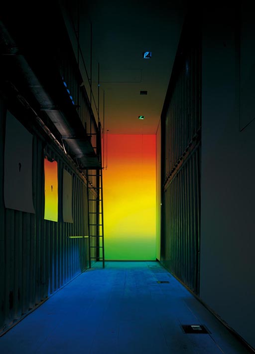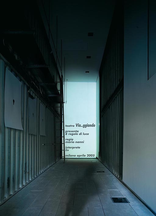 Via…ggiando arrives and a new journey begins inside it. switch on a lighting installation and its anonymous outer walls are transformed on the inside into a surface with varying images, walls broken down by the movement of light, luminous carpets on which to walk or to lie, so as to get a better view of the ceiling …which is no longer there. light has de-materialised it. this space thus becomes the place for living: ‘living does not mean only to be on earth, but also to be under the sky’ (martin heidegger). the three dimensions of space become four: we add the dimension of sense and feeling. the variable-image light bulb is the protagonist. people who live in the place called Via…ggiando bring it to life and vice versa: a dialogue is set up, coming in part from choices in design and building and in part from the curiosity and participation of those who set in motion the theatre of light. everything begins with the entrance (1). you enter from the south: the sun accompanies your route, shows you which door to open, invades the interior space, projects the shadow of the traveller on the ground, and then disappears when the iron door closes once more (2).