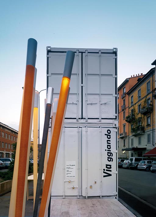 Via…ggiando Viabizzuno is a project between theatre of light and architecture; it is a space for living in, designing, projecting, installing. the container is a place in movement, a volume which moves and appropriates a space. we open it, and only then do we realise what it is: its content makes it a suitcase, a house, a theatre. it is temporary architecture, not simply contemporary. its modernity comes from the speed with which it changes, from its organised impermanence; it is the place where modularity, lightness, transportability and flexibility co-exist. from two sterile containers placed one on another our project creates a living environment, built around the life of people because inside it a story unfolds, different each time, set in motion by glances, movements, and gestures.