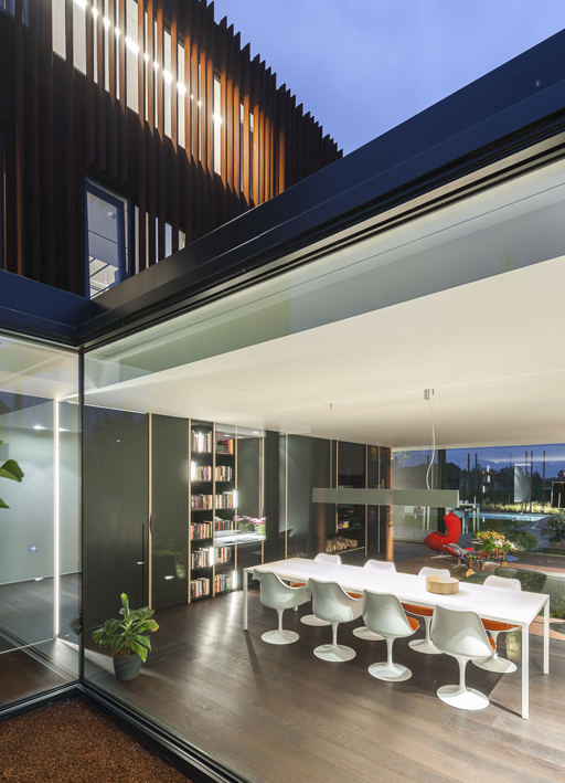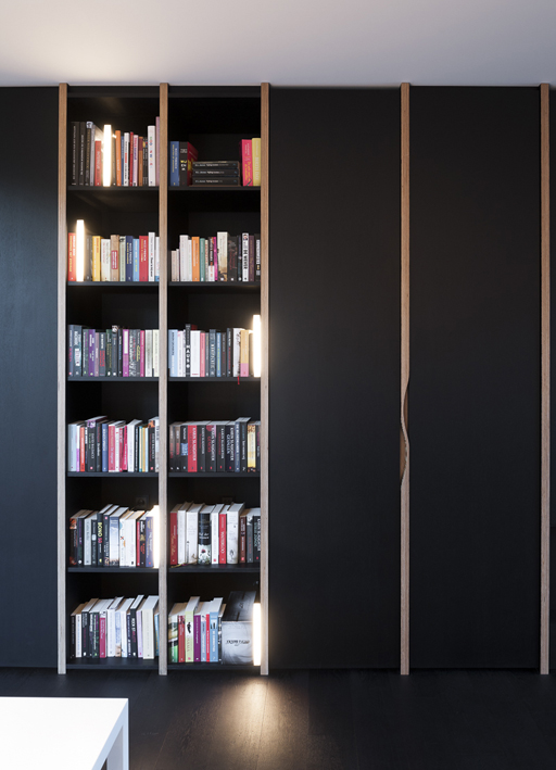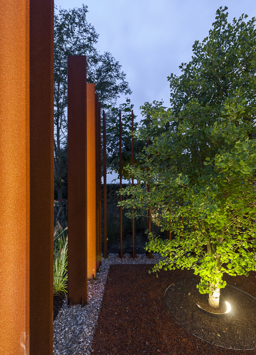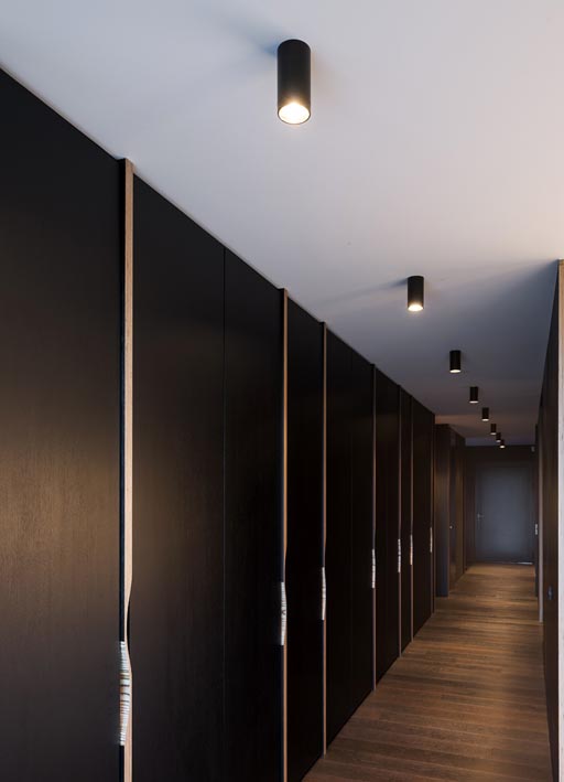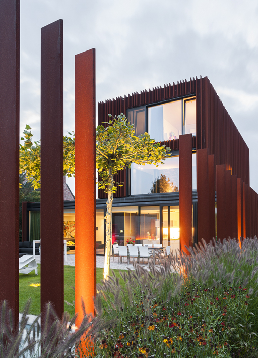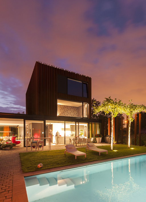the concept of this house, on the outskirts of antwerp, is entirely based on the use of corten steel slats, both internally and externally, which create a protective shell around the house. in addition, to revolutionise the traditional building volume of a typical two-storey flemish house, the house was designed all on one level, with the addition of a small tower. a patio was created on the western side, allowing natural light to penetrate right inside the house. the lamellar structure defines the spaces, enclosing them when necessary or creating openings, as well as emphasising the vertical aspect of the building. the slats vary in density according to the function of the domestic space behind them; the garden and swimming pool are partially covered to respect privacy, while in the garden area around the ginkgo trees they are fewer in number. outside the slats that surround the garden, the vegetation is left to grow naturally and displays all the bright colours of the local flora, in harmony with the warm, natural oxide of the corten. much detailed work was needed to enable the slats to be used as cladding (welded onto a perforated plate), as a gate for the garage and for the individual slats surrounding the garden (fixed to a special invisible structure), as well as for the paving around the ginkgo. the particular shade of colour of the oxidised material ensures that the slats capture the orange light of the sunset, providing a warm intense glow and a play of shadows on the façade. the effects of natural light on the material, combined with those of the artificial lighting, accentuate ‘the elegance of rust’, emphasising the feeling of long standing given by the signs of aging. the lighting design was also based on the idea of a protective shell and on verticality. for all these reasons, the m4 fittings were positioned randomly so that the warm colour of the halogen light, reflected off the corten, blends with that of the sunset, creating feelings of intimacy and wellbeing. in the garden, the swimming pool acts as a barometer and is tinged with a different colour each season; in the winter the unaghi fittings are an inviting warm white, whereas in summer they turn a cooler white. along one side of the black block that divides the house in two is a long corridor, which ends with a view of the garden. the length of the corridor is emphasised by using a series of cilindro 15 pl fittings. the other lamps are hidden, like the 13x8 fittings installed within the thickness of the doors or the librO’ fittings placed between the books. inside too, the choice of light fittings and their location are in keeping with the characteristics of the materials and the lamellar structure. the lama fittings, reminiscent in shape of the corten steel panels, create different moods according to the lamp used, fluorescent during the day, halogen in the evening. the living room table is softened by the warm light of the tagliata fitting, slotted like the corten structure.