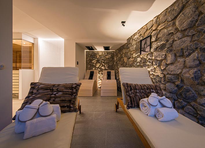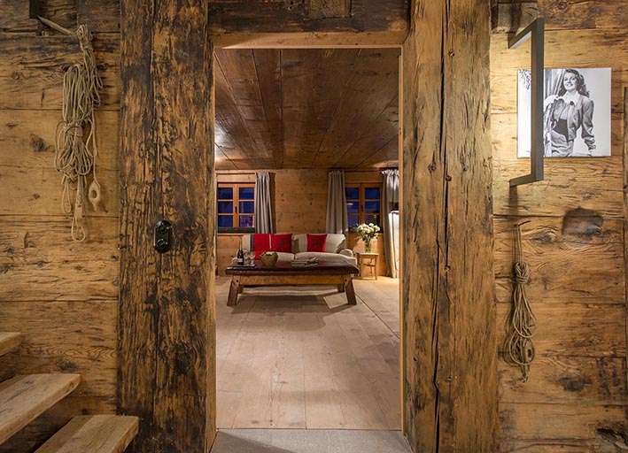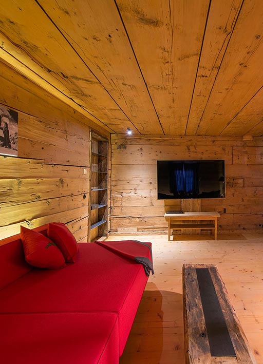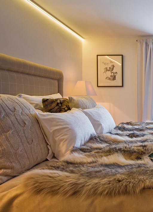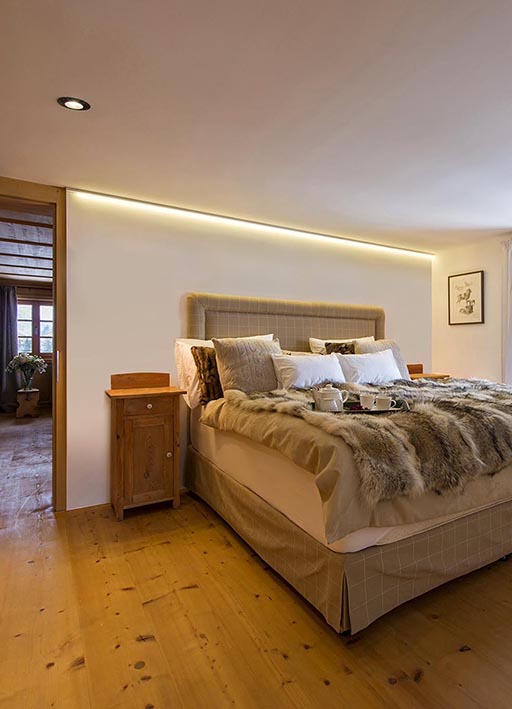 the architectural elements with their traditional character have been carefully restored and contrasted with the more modern materials and finishes. the combination of essential architecture, characterized by straight lines, and the historic elements creates an effective contrast. the predominant material is wood, large panels of which cover the entire area of the living room, the cinema room and the bedrooms. ceilings, floors and even walls are actually solid, rustic, knotty wood, creating a simple and natural ambience, in which to immerse oneself in nature. the use of light has also played a key role in accentuating the contrasts between materials and forms. the tactile perception of rough old structures, perceptible under a beam of light, coexists with the smooth edges, highlighted by precise, thin beam lighting. the use of wallwasher transforms entire walls into a lighting units. the choice of products such as 'lettera c' for illuminating paintings, p1 as small, elegant spotlight to pick out individual items of furniture, the 13x8 and c2 hidden profiles and items of art suitable for this space as 'litro di luce', has given the chalet the charm needed to create a comfortable environment of well-being.