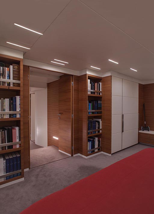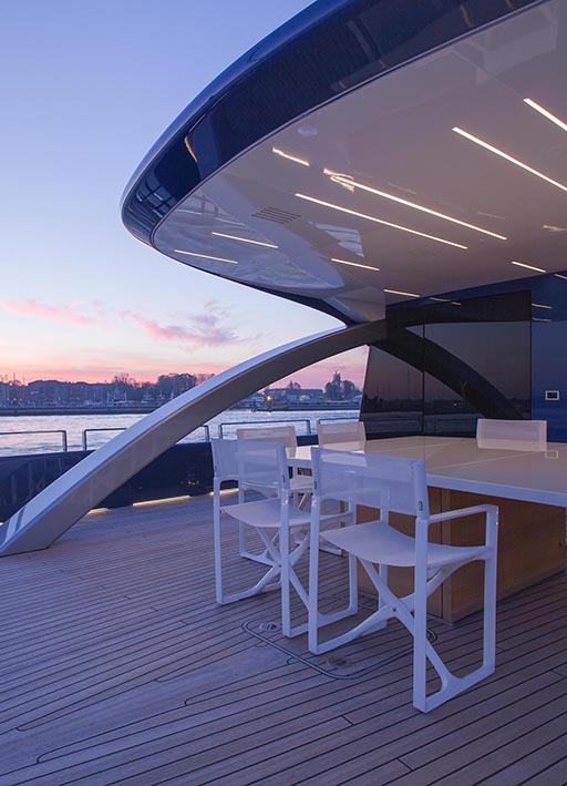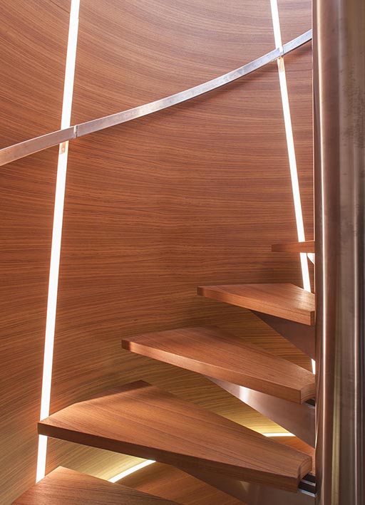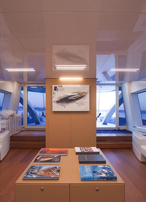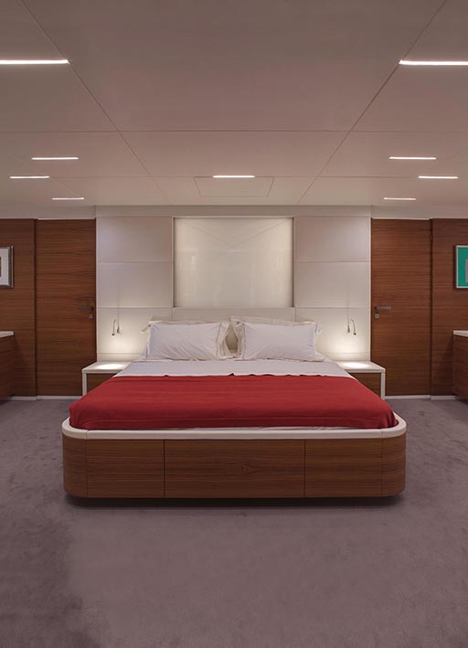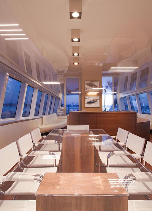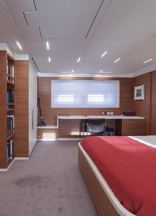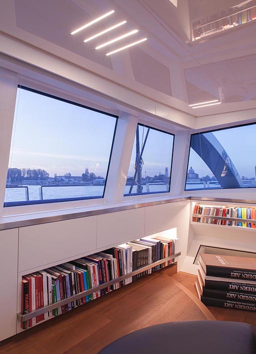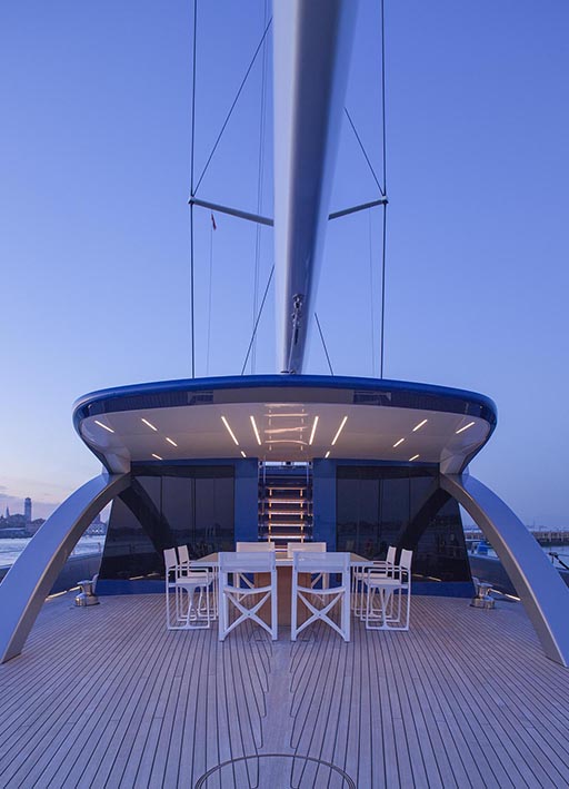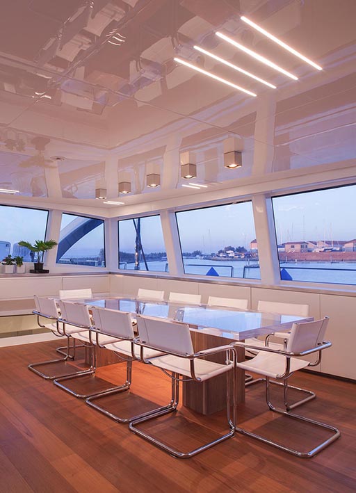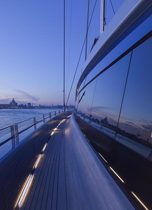 nativa is a 48 metre, 280 tonne mega motorsailer with a 63 metre mast, that was born in the venice shipyard arzanà navi. the hull and superstructures are in aluminium and the ballast is lead. the mast is in carbon fibre, continuous lamination without joints, unique of its kind. nativa is designed to reach up to 16 knots under sail: the running rigging is wholly power-assisted so the large sails can be easily handled by a skeleton crew. the yacht is moreover equipped with a large spade rudder, hydraulically controlled and with dual steering station, which achieves manoeuvrability comparable to that of a racing yacht. the vessel can accommodate ten guests plus eight crew members: the guest cabins, with modern and refined lines, and the owner’s suite, are accessible by way of a wide and spectacular spiral staircase and are situated underdeck. amidships on the main deck there is an ‘open space’ lounge with large windows that give a complete view of the sea: this design choice contrasts with the usual sailboat layout but has the aim of coupling the performance of a motoryacht with comfort. nativa also has a spacious flybridge with pilot house and living area. the clean lines of the hull and the interior decoration called for a special lighting, capable of adapting to the various features and functions of the spaces. so the choice of light fittings went hand in hand with that of the materials, furnishings and colours. the 13x8 was used in a versatile way to meet different lighting requirements: in the night area the light fitting was inserted between the seams of the leather ceilings and also used along the corridor as a courtesy light: the effect is one of simple vertical cuts which also inspired the design of the boiserie. the stairway is lit by 13 x 8 beams of light which highlight the verticality of the structure. the spingi was chosen to light the owner’s desk, an ideal solution from both the aesthetic and functional viewpoint.