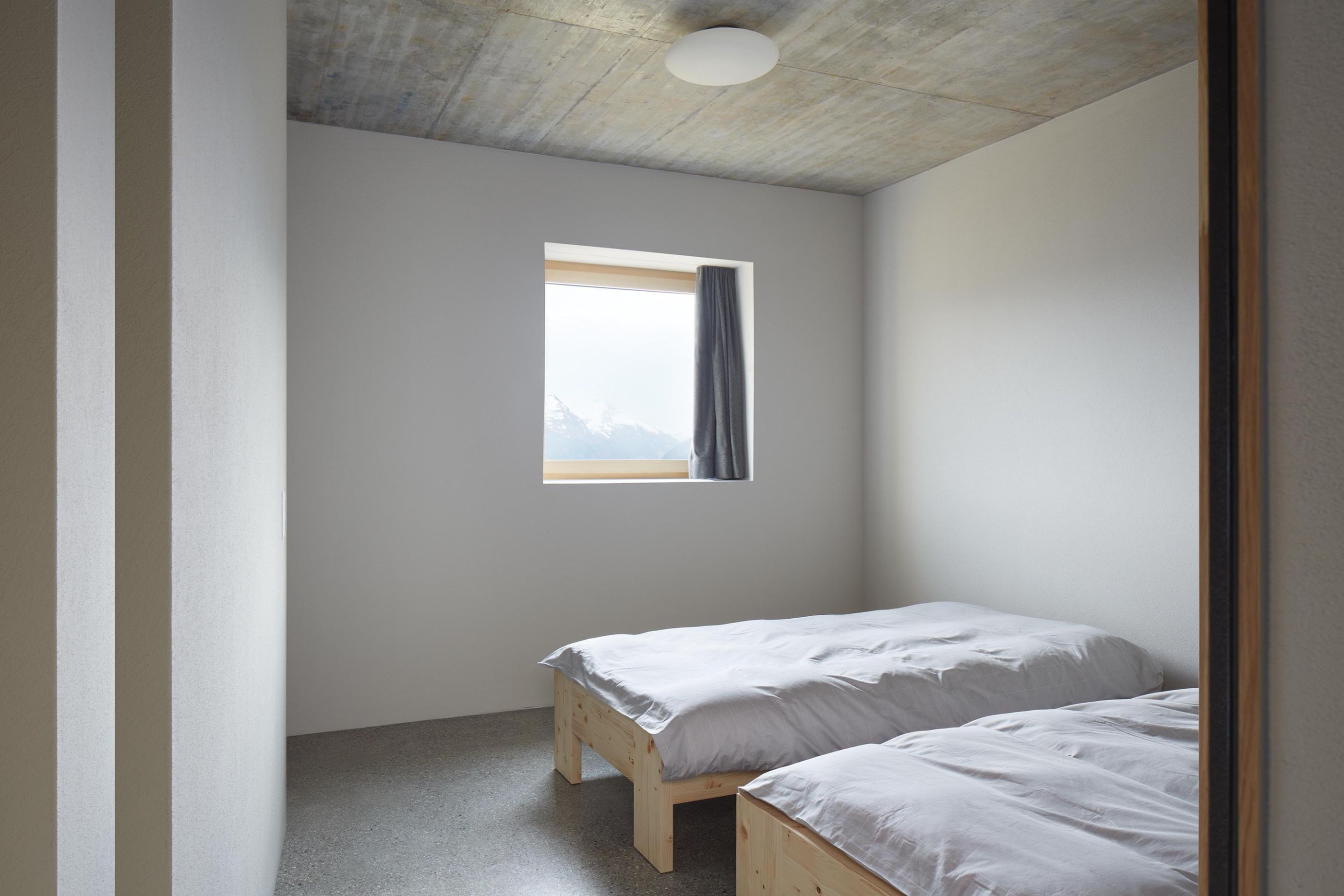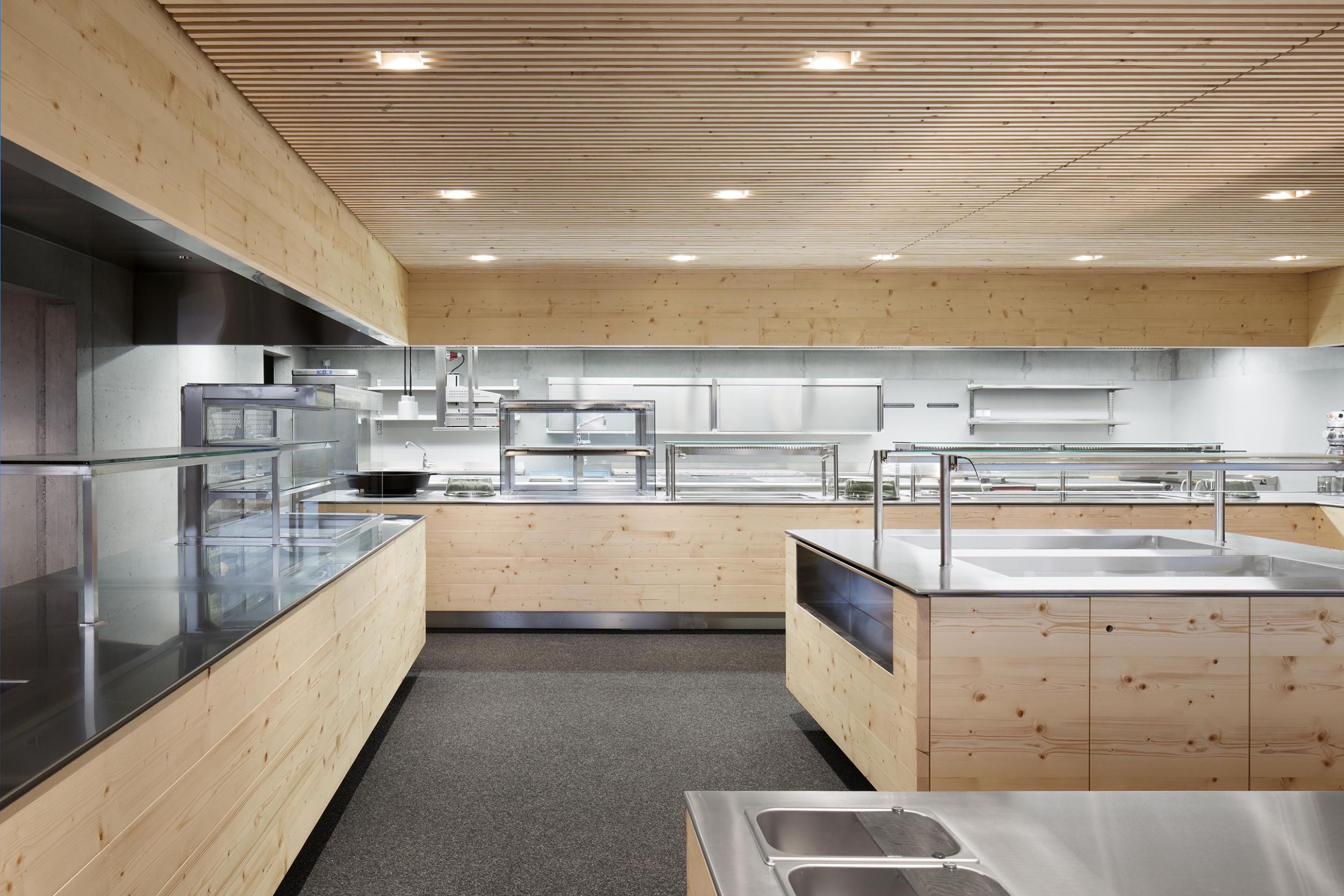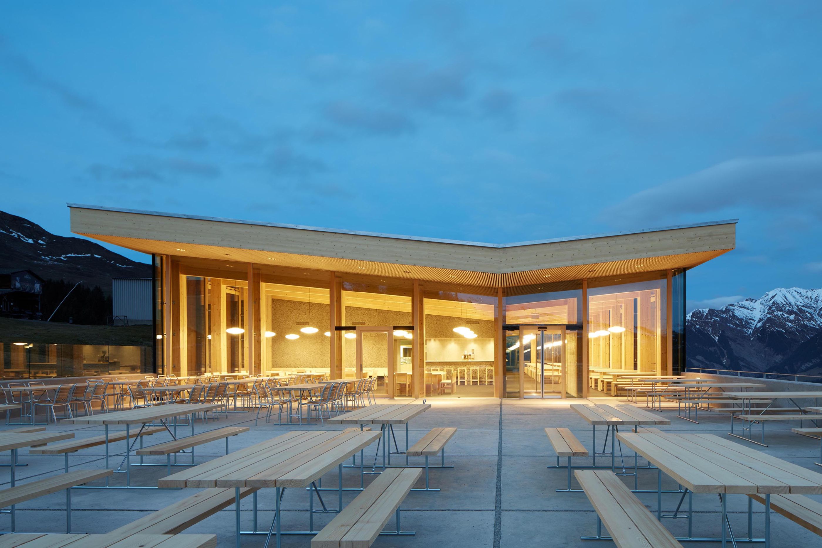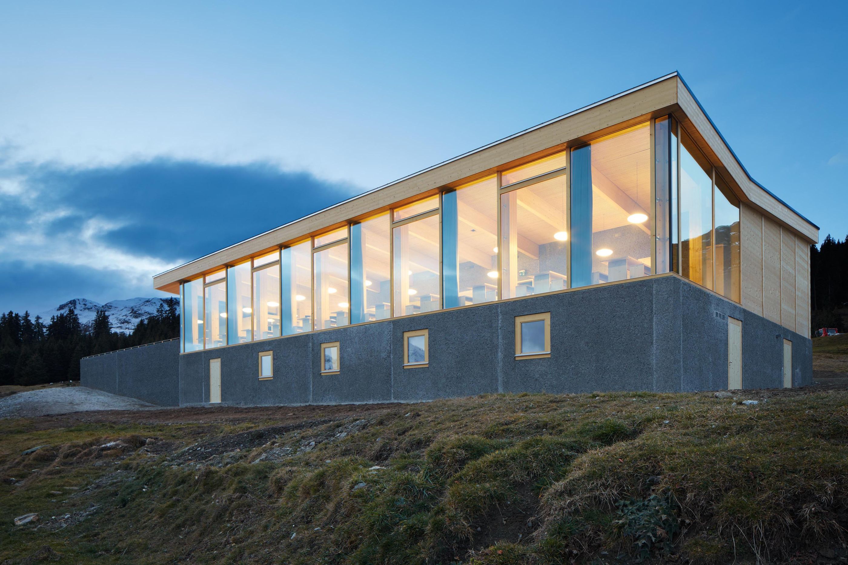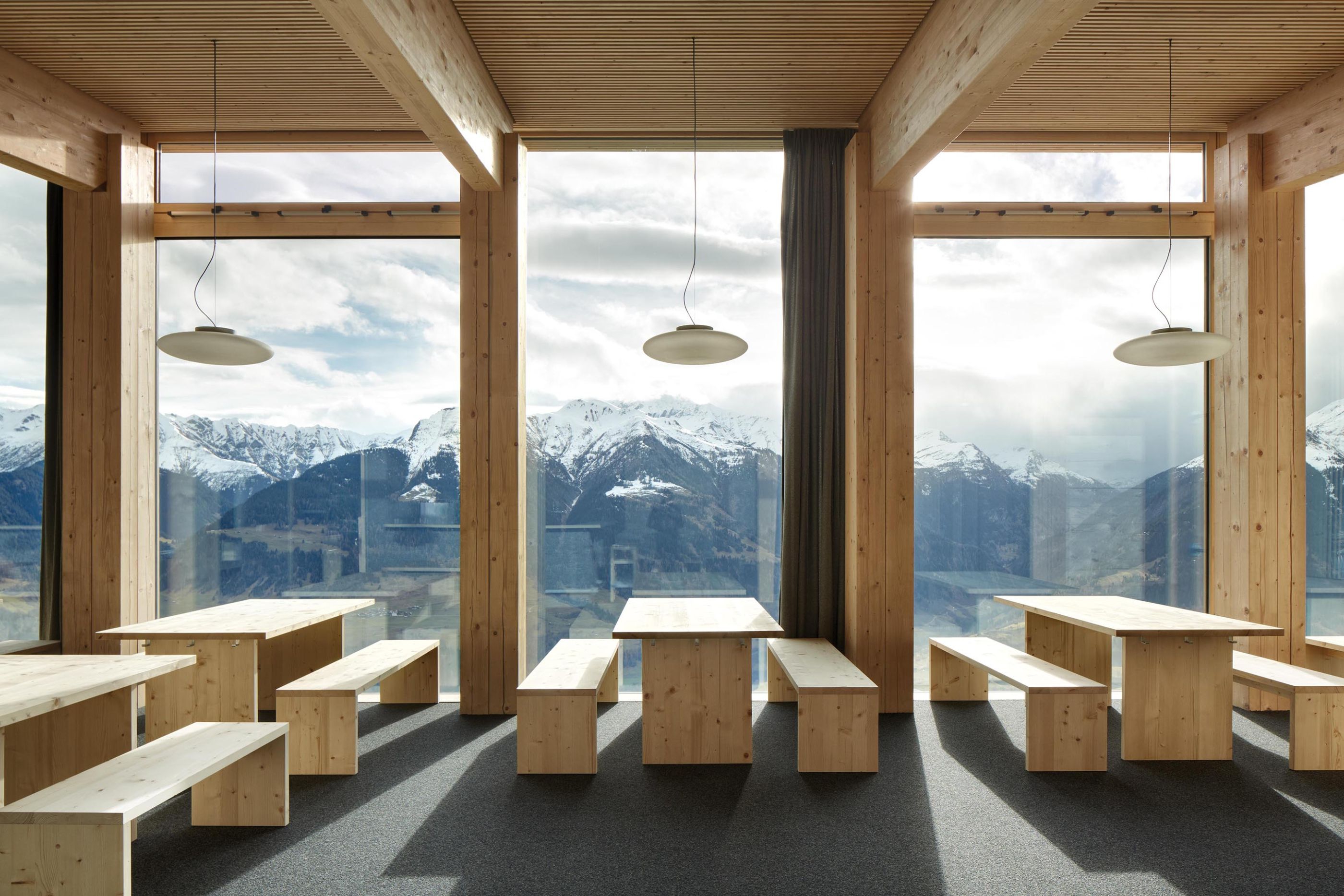 the historic triel mountain restaurant, in the canton grigioni, has been recently renovated, moving a little its original position to improve the circulation of skiers along the ski slopes and ski stations. the right side of the building stretches on with a panoramic terrace while the asymmetric roof, sloping on both sides, opens the building body towards the mountains and the valley; this effect is amplified by a facade entirely made of glass at the ground floor. in this way, the new structure embraces the surrounding landscape beauty and the bright light typical of high mountains, exploiting the optimal luminous effects also indoor. the surface of the building base, as well as the ground floor core, is made of concrete. another part made of red fir wood completes the ground floor. along the south-east and south-west facades, entirely made of glass, there are hardwood pillars inside. there is also a wooden-beamed ceiling. in the ground floor core area, the outer layer of the facade continues: here the glass is replaced by hardwood beams. the roof shape refers to the building drawing: the deepest point of the beams is located on the entrance line, on the vanishing of the central wall, and allows a clear spatial distinction between the dining and non-dining areas. in the basement, along the south-east facade, there are three private rooms and other extra spaces. the artificial lighting of the building is assigned to the lenticchia. the elliptic, rounded, delicate shape of this fitting balances the rigidity of interior lines and wood furniture in the restaurant area and in the rooms. in the first one, the suspension version has been used: it is in fact more suitable for accomodating spaces, while in the rooms the lenticchia plafone has been chosen: its more discrete position allows the sun light that seeps through the windows to illuminate the cold shade coloured walls, having no obstacles.