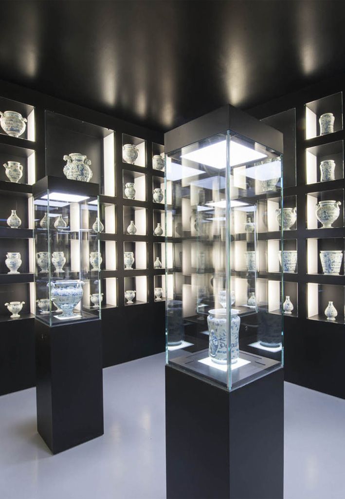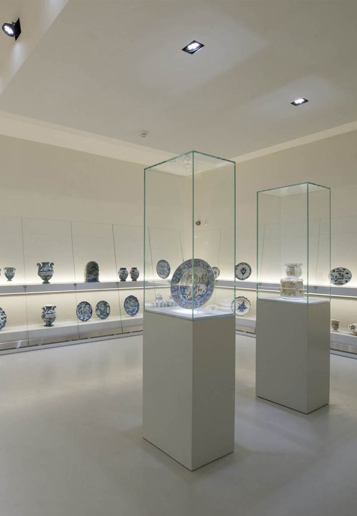 with its wealth of significant exhibits, the museo della ceramica illustrates the aspect of human activity that most fully identifies the artistic and productive history of the district around savona. within it are displayed around a thousand ceramics of great artistic value, from the fifteenth century up to the present day, exemplifying a tradition whose fruits have been in evidence continuously for more than six centuries in savona and albisola, historically among the most important centres for the production of ceramics in the mediterranean. the premises, which were created with the restoration of the palazzo del monte di pietà of savona, founded in 1480 at the behest of savonese pope sixtus iv della rovere and his nephew cardinal giuliano (later pope julius ii) and dating, like all the surrounding buildings of the old town centre of savona, from the thirteenth century. the museo della ceramica is combined into a single exhibition with the civic art gallery housed in the adjacent palazzo gavotti. the policy pursued in the restoration work was to preserve and philologically restore the parts of the building where there were obvious traces of historical transformation activities that had taken place over time. the widespread but significant modifications made to the building during the twentieth century, with significant alterations of many structural elements and the loss of much of the ancient exterior facies of the rooms, led to measured but significant contemporary architectural interventions and the inclusion of very up-to-date elements at both an architectural level and in terms of the furnishings employed. interventions that were never destructive, but reversible and sensitive to the building’s history. the intention of the project was to create a setting that was neutral but certainly not prosaic. four primary materials were use and four colours: the floor, the display cases and the majority of the display stands in light grey resin, the white washed walls the ‘colour of the air’, the architectural elements in satin stainless steel and glass. the idea was for the ceramics to give the museum its colour; the result is evidence of its success. this ‘white cube’ type of arrangement is occasionally interrupted by moments of stark contrast intended to surprise the visitor and to make an impression in his memory. in particular we must highlight the black room that houses the numerous ‘white-blue’ pieces of the collection of pharmacy jars from the san paolo hospital, with a pop art flavour for the redundancy of these objects of everyday use, or the double height structure accessible to visitors, of steel and glass, designed to exhibit the prestigious collection donated by prince arimberto boncompagni ludovisi. particular attention has been paid to the study of the light. the choice, the result of extensive testing, swung towards high colour saturation 5,000° k LED, so as not to alter the colours reflected by the ceramics. a measured, but decisive, result obtained by a lighting design capable of being effective both from a functional point of view and aesthetically, with the choice of built-in light fittings that are either fully concealed (m6) or external, like the sign lamps (trasparenza), always simple and never invasive.