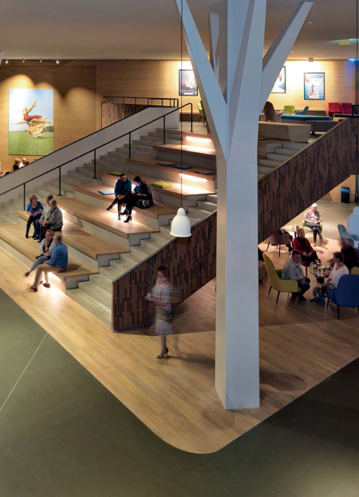 built in 1983, theatre du bussel, which also incorporates the theek5 library, is undoubtedly one of the most significant structures in the cultural framework of oosterhout, dutch city of the northern brabant region with over 50,000 inhabitants. after assessing its inadequacy to meet the modern needs of the city, the municipal government decided to entrust the architecture firms 3to architecten and dp6 with the task of restoring the theatre. the project developed by the two architecture firms had thoroughly renovated the building by making it a symbol of the cultural development of the little town, perfectly integrated in an urban context dominated by the oosterhout basilica. this effect was also achieved by selecting a shaded colour for the façade, similar to the colour of the external flooring. its wavy façade has been designed to recall the idea of a big tent, while turf has been installed on the roof to considerably please the looks of anybody who observes the structure from the windows of the private buildings or hotels in the vicinities. the connection with nature is one of the most distinguishing features of the theatre. being located in an area traditionally filled with trees, the designers let themselves be inspired by these natural shapes at a structural and symbolic level as well. the load-bearing columns of the hall, in fact, have been designed the shape of a tree and prints of the local flora have been placed along the walls. the restoration work was completed in october 2015. today the building houses a wide and modern room with 500 seats and a new room with 200 seats. in addition to that, the existing foyer was extended with an area where Viabizzuno recessed lights integrated in the false ceiling added volume to the entire architecture. the basic lighting system consists of customized 070 profiles with eco led spots that cross the entire building from side to side, to unite the two intended uses (library and theatre) into a single visible building. the dark crevices enlightened by spotlights recall the light beams used in theatres and are completed by thin m13 spotlights with 13x8 led light lines and signoria suspension luminaires that create ambience light and favour the visibility of the building form outside, thus inviting passers-by to stop en enter to see which shows are on the program, linger in the literary coffee shop or visit an exhibition. that is how de bussel has become oosterhout’s sitting-room.