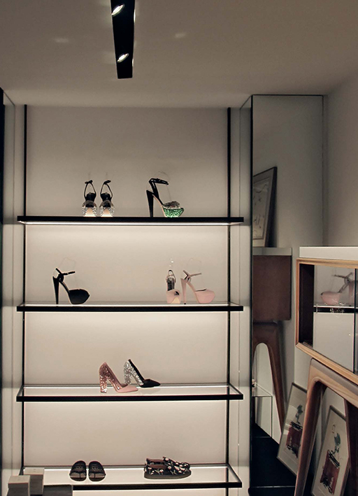 after the first showroom in rue boissy d'anglas came a second one across the street: a warm, sophisticated space designed to show the products of the stylist's creative verve and imagination - his fabulous clothes, footwear and accessories - in the very best light. in order to frame them in all their fabulousness, the architect chose men sole by Viabizzuno, a shelf lighting solution designed by mario nanni and featuring plug'n'play power rails in a special high-conductivity alloy.
