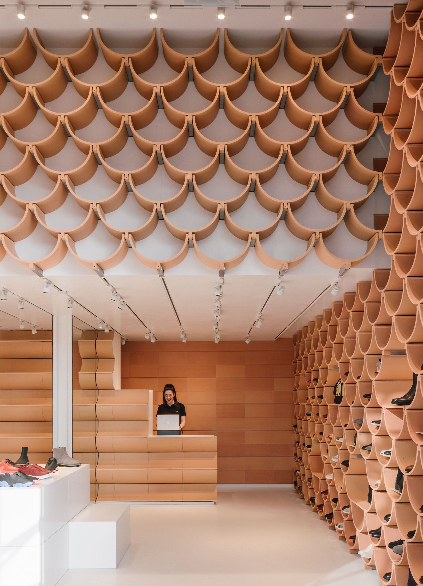 the kengo kuma project is characterized by raw ceramic tiles, made by the spanish artisan company cumella and used as display media.
