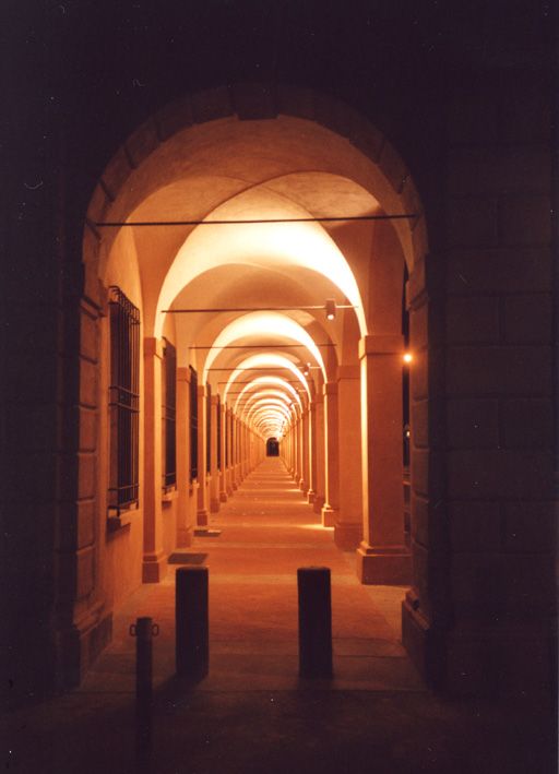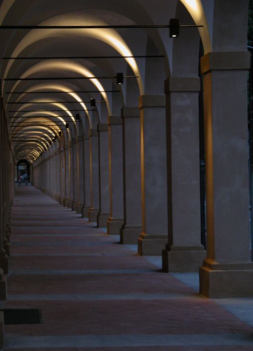 It is a simple, functional architectural structure, comprising a series of arches supported by pillars, in keeping with the historic model so frequently found in bologna. the only concession to the classical monumental style is to be seen in the elegant arch at the beginning of the portico, close to san gregorio church, with its ashlared face surmounted by a curved typanum, similar to the style of the city gateways.