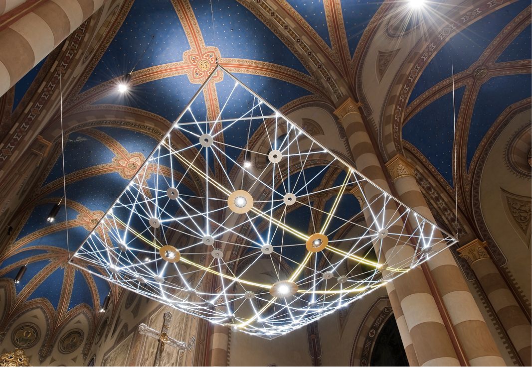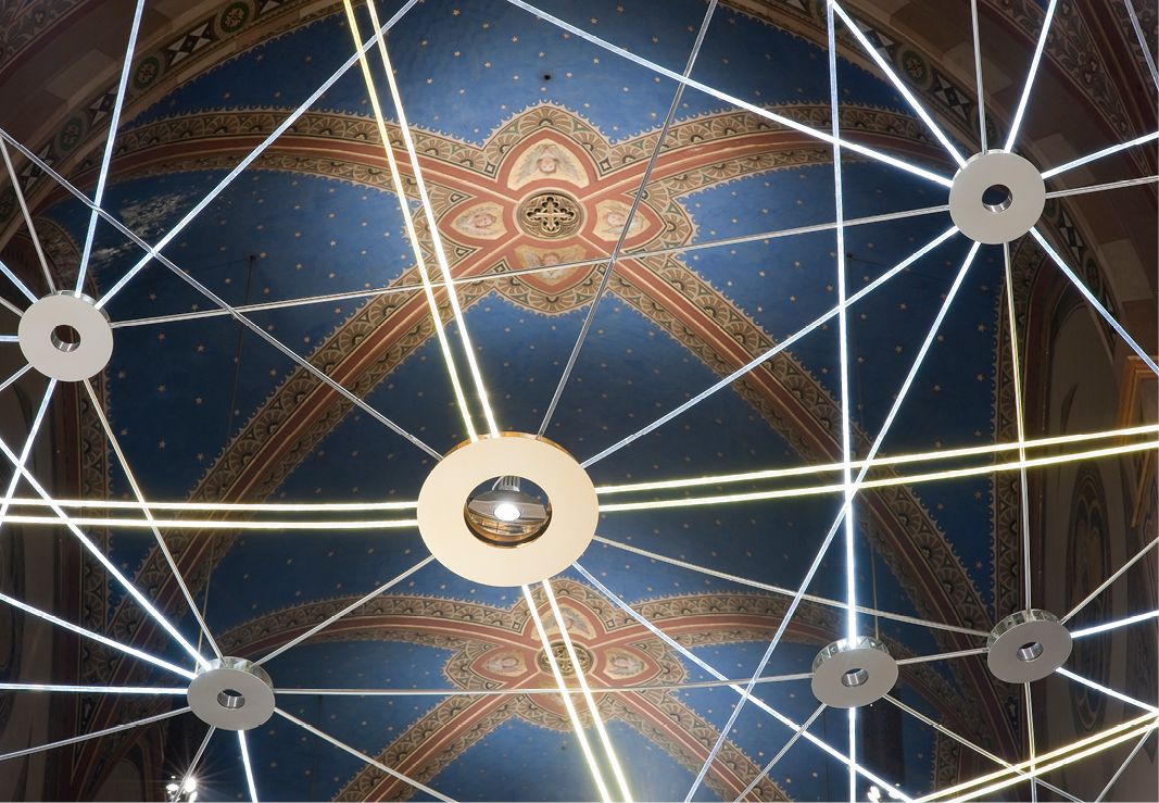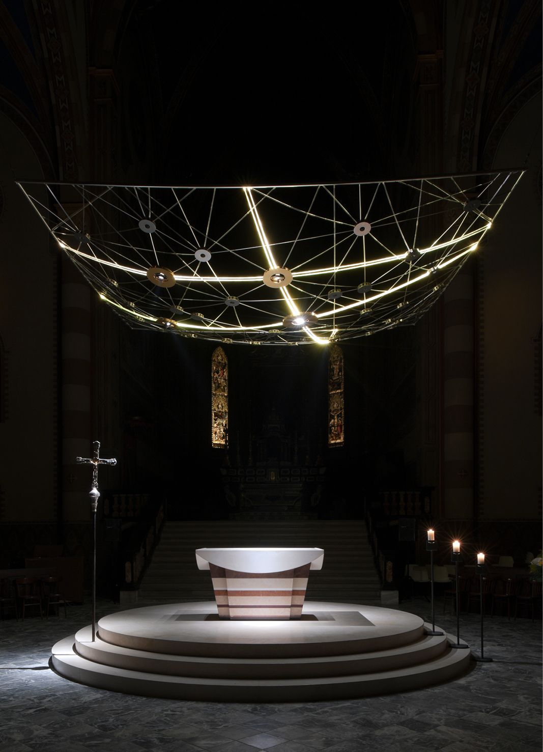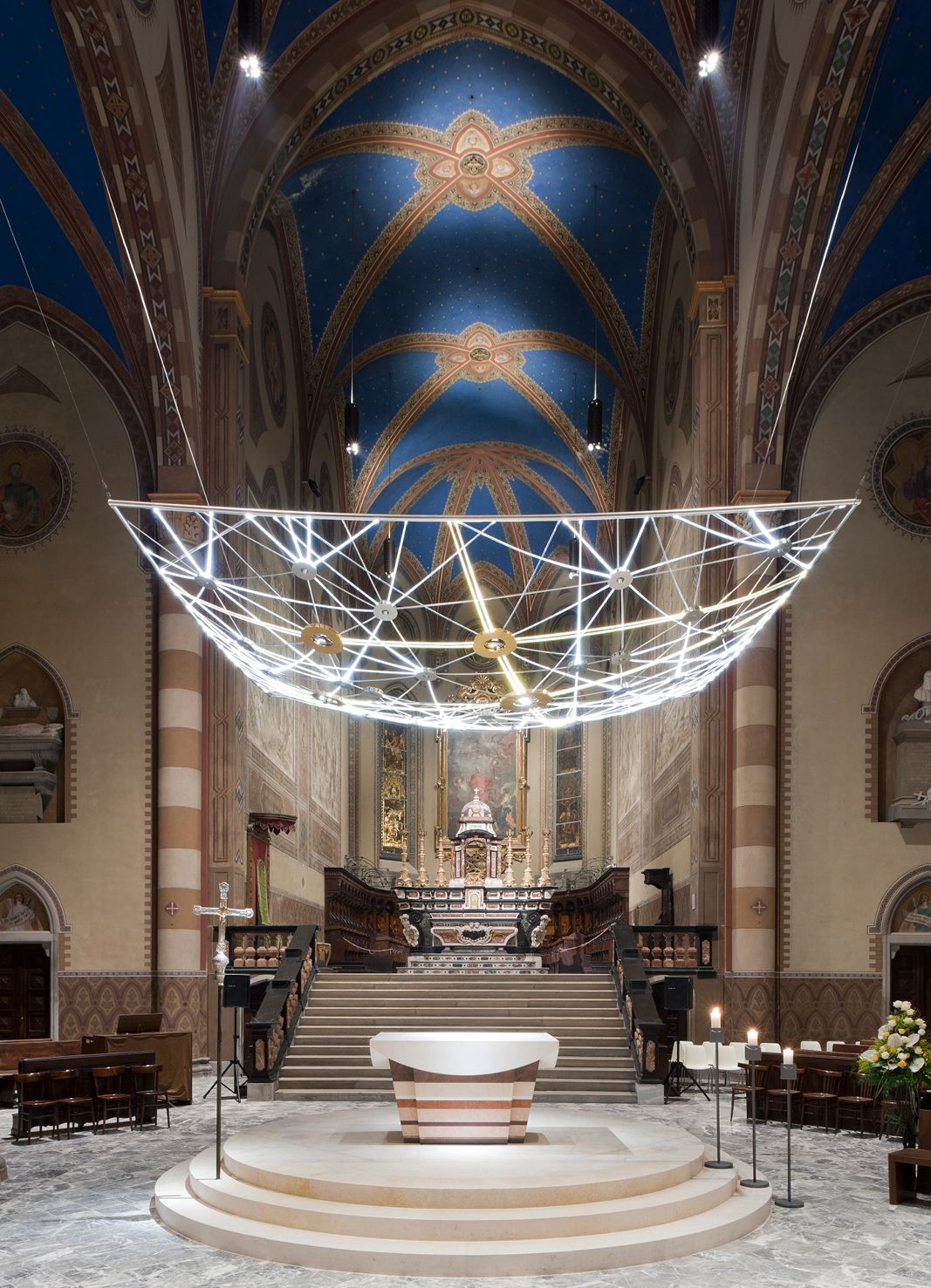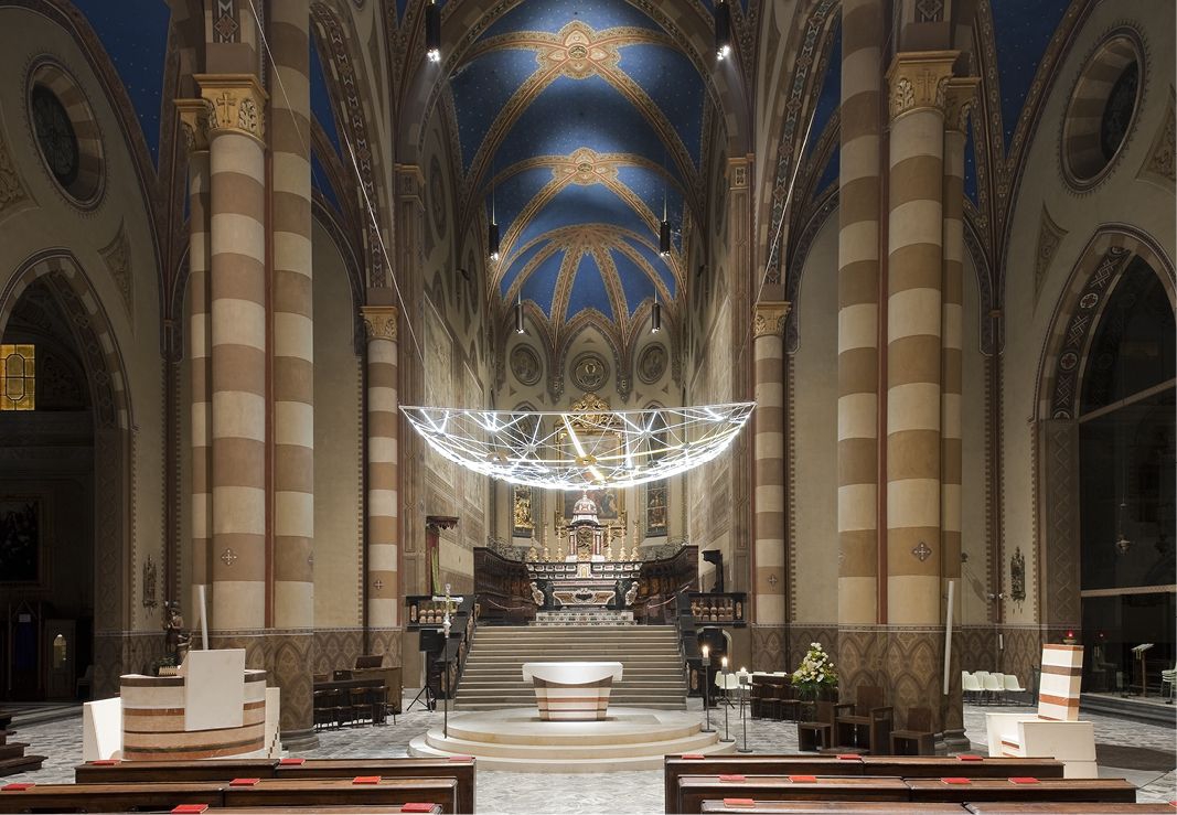 the design proposal, aimed at adapting the cathedral of san lorenzo to the acquisitions of the last liturgical reform, is the winning entry in a two stage competition that the diocese of alba held in 2007 / 2008. massimiliano valdinoci’s architectural team supervised the refurbishment of the cathedral and its lighting. as part of this adaptation and as a major symbol of the changes underway, an illuminated canopy was installed, conceived and designed with Viabizzuno. not only is it an illuminated object and a functional light fitting, but also a mystical element and a symbol of how enhanced spaces were once created within the wider body of the church. the canopy came from the idea of creating a glorious illuminated ciborium, whose light becomes an immaterial presence, constituting the network of relationships that can delineate the space without filling it. so this feature, located above the altar, finalises and completes the cathedral’s liturgical adaptation, performing a dual role: to indicate the centrality of the eucharistic table, alluding to the descent of the holy spirit at the time of consecration (the epicletic dimension), and finally to direct the eyes of faithful upwards and towards the distant perspective of the choir. the ciborium-canopy consists of components arranged in an original design that echoes the geometry of the constellations, invoking the sky, speckled with stars, painted on the vaults above but, at the same time, it also alludes to the urban fabric of great cities, by establishing a parallel between the city of man and heavenly jerusalem. its function is to create a zone of luminous silence, which emphasises the presence of the altar by avoiding the uniform lighting of the nave, achieved with special light fittings situated higher on the vaulted ceilings and designed specifically for the project. the canopy lights are the boundary of this space, which encompasses the entire altar platform and they bespeckle the important features, placing strong emphasis on the table and with it the symbols and gestures associated with the ritual of the eucharist.