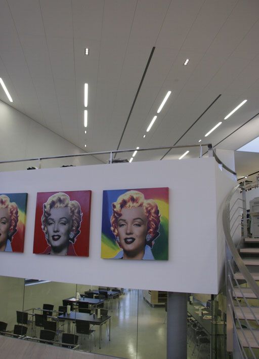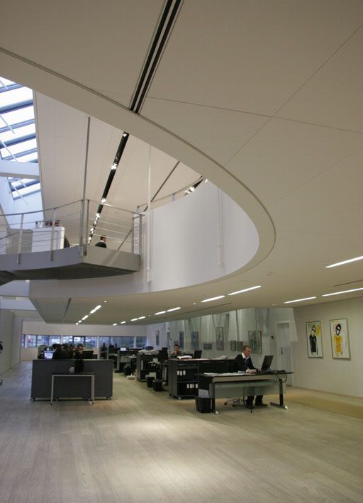 the concept at the basis of the texman building sprang directly from the clients' wish to include all functions in one large office space. the idea was to create an atmosphere of work continually in progress - productive yet at the same time pleasant: the various departments are defined by different levels, but colleagues can communicate by means of visual contact at all times. this encourages greater participation in the work in progress, a type of cohesion typical of group collaboration, as though workshops took place in the texman offices every day. the varied levels, inner courtyards, facing parts and connecting corridors characterise the space and confer great flexibility: and the lighting has to integrate with this atmosphere. lighting has been designed to vary with the varying functional requirements, while at the same time defining the specific differences of the varying levels. above the desks 094 have been positioned along slits, so that the right light can be created at every single work station even if the furniture and arrangement differ: the flexibility which characterises this lighting system is ideally suited to an open space of these dimensions. the same slit appears vertically, in the full-height volumes, as a graphic sign indicating the routes through various levels and at the same time emphasising the vertical character of the building in its full-height space. a number of net recessed lighting fixtures have also been used, their clean lines outlining the ceilings and accompanying the architectural composition of the 094 system. in correspondence with the large halls which figure as bright inner courtyards, xxx suspended lights hang from the ceiling; their imposing size means that they are not lost in this space; on the contrary, they enhance it and draw the visitor's gaze from the highest ceiling to the flooring of the ground floor, making it possible to appreciate the varied levels and their functional characteristics, chief among which is the display of clothing produced by the texman company. this entire interior layout corresponds to a curvilinear exterior characterised by long narrow windows: large glass surfaces which give rise to an indoor “conversation” between artificial lighting and natural light.