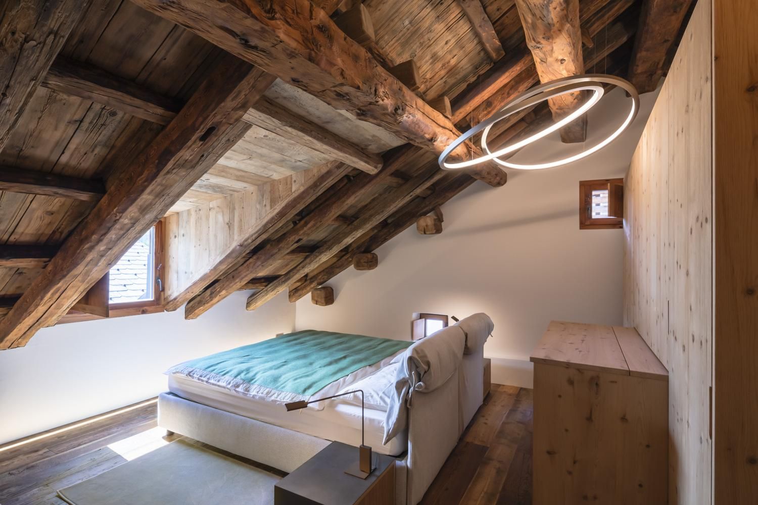in the bedrooms, c2 anelli and roy create different levels of lighting to suit needs. the timeless finishes and lines of these lamps enhance the natural materials of the furniture chosen for this and other rooms in the home.