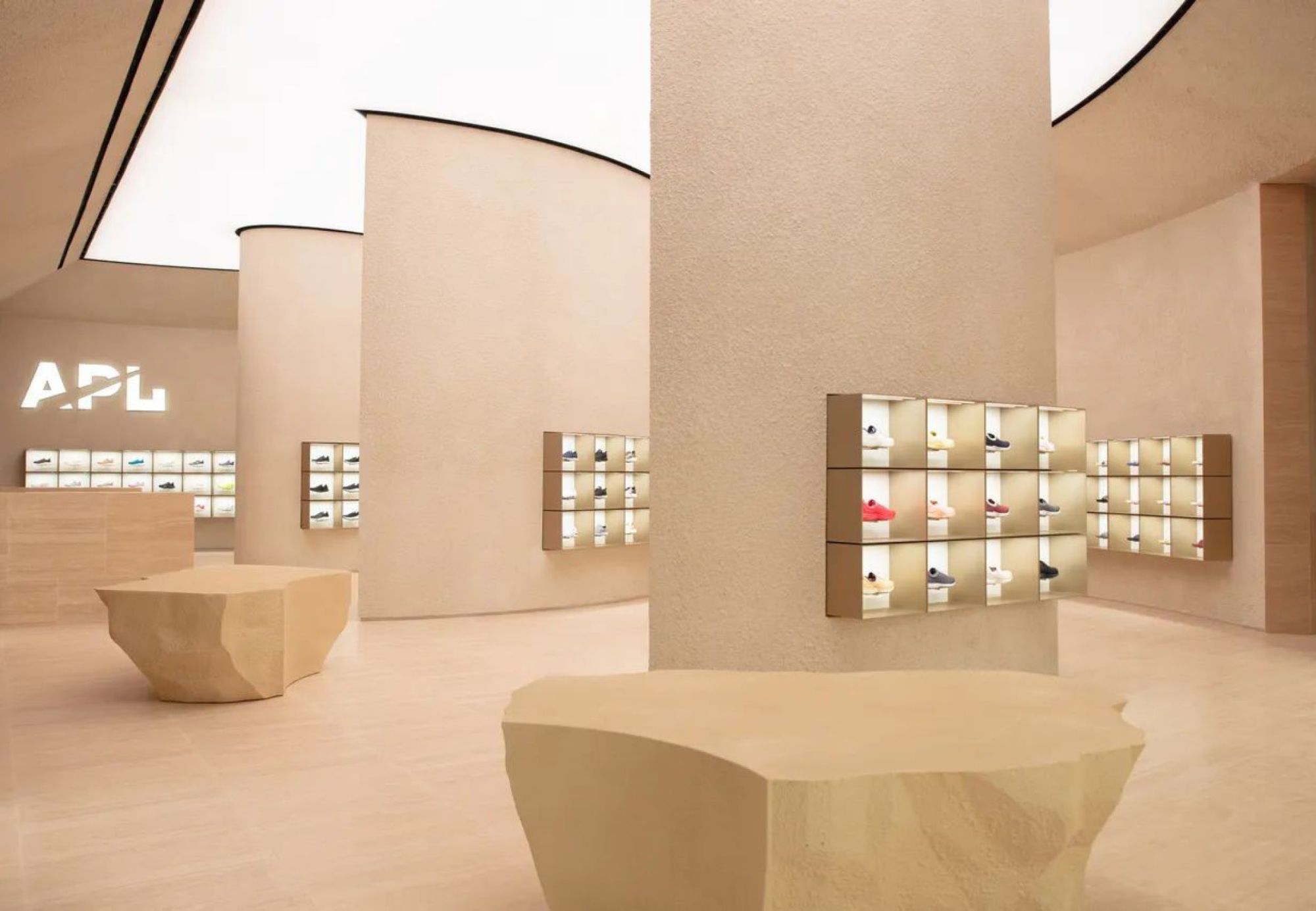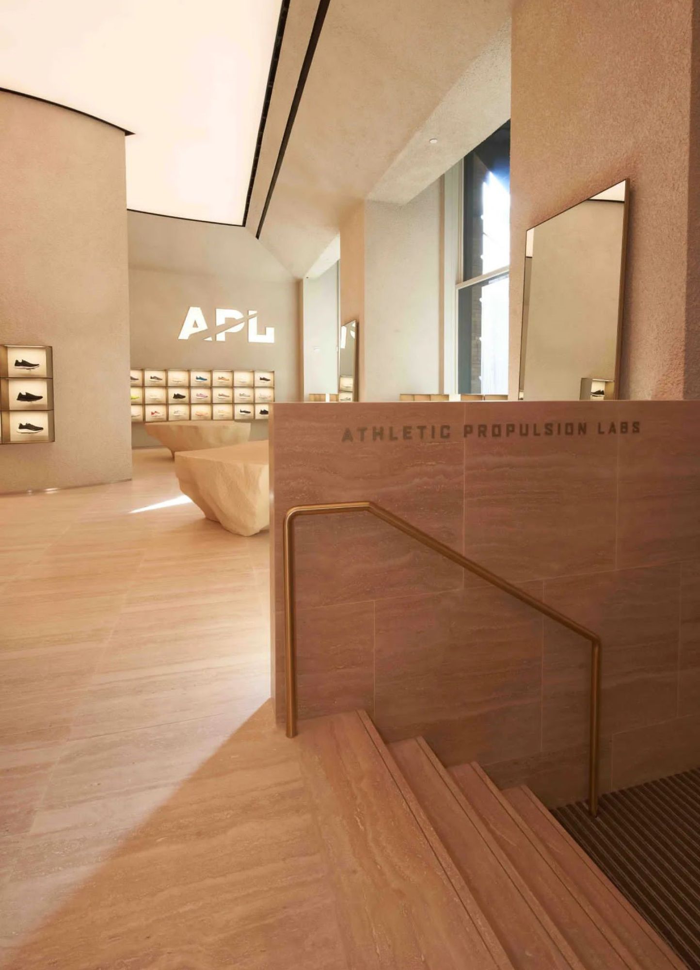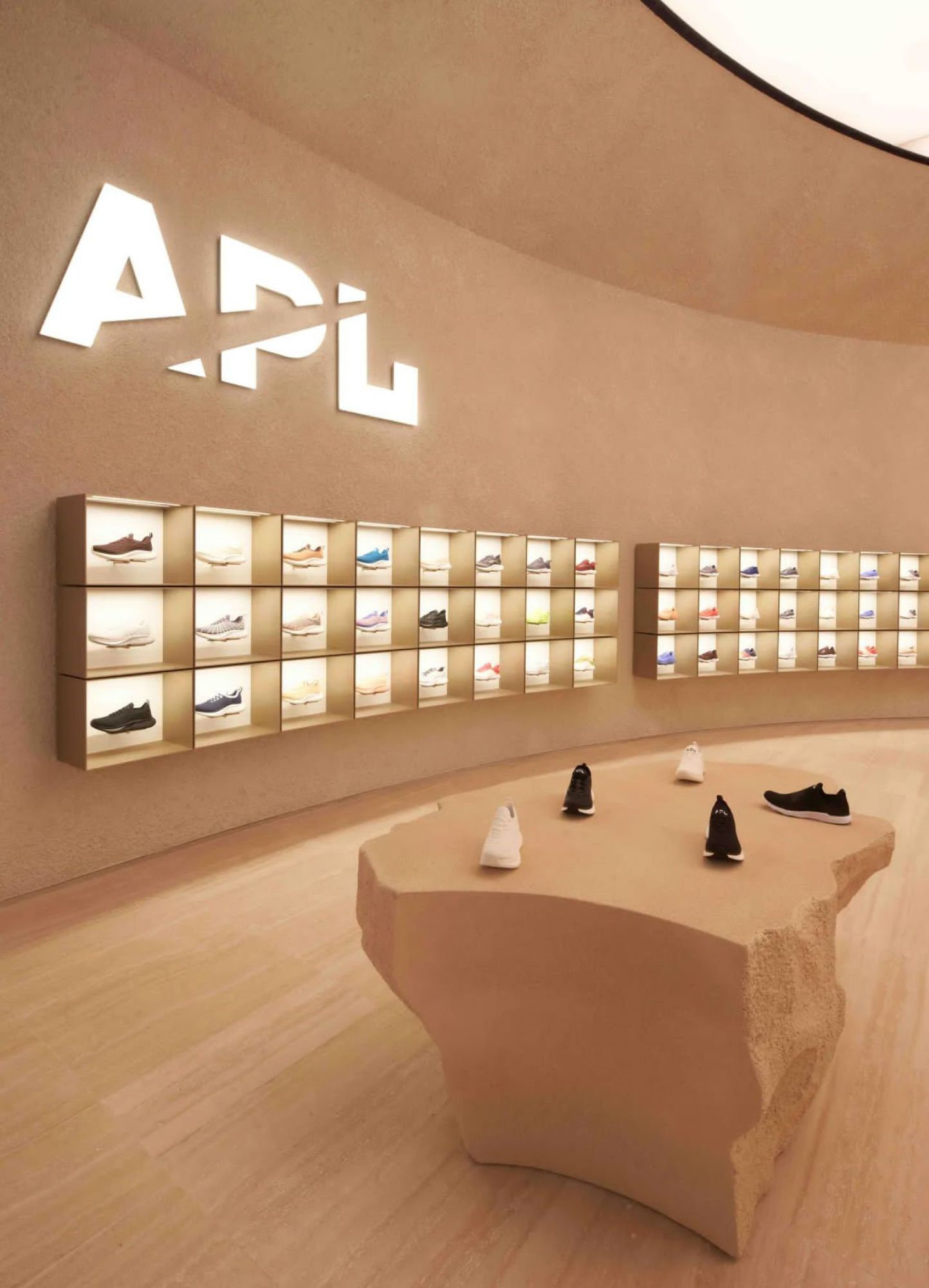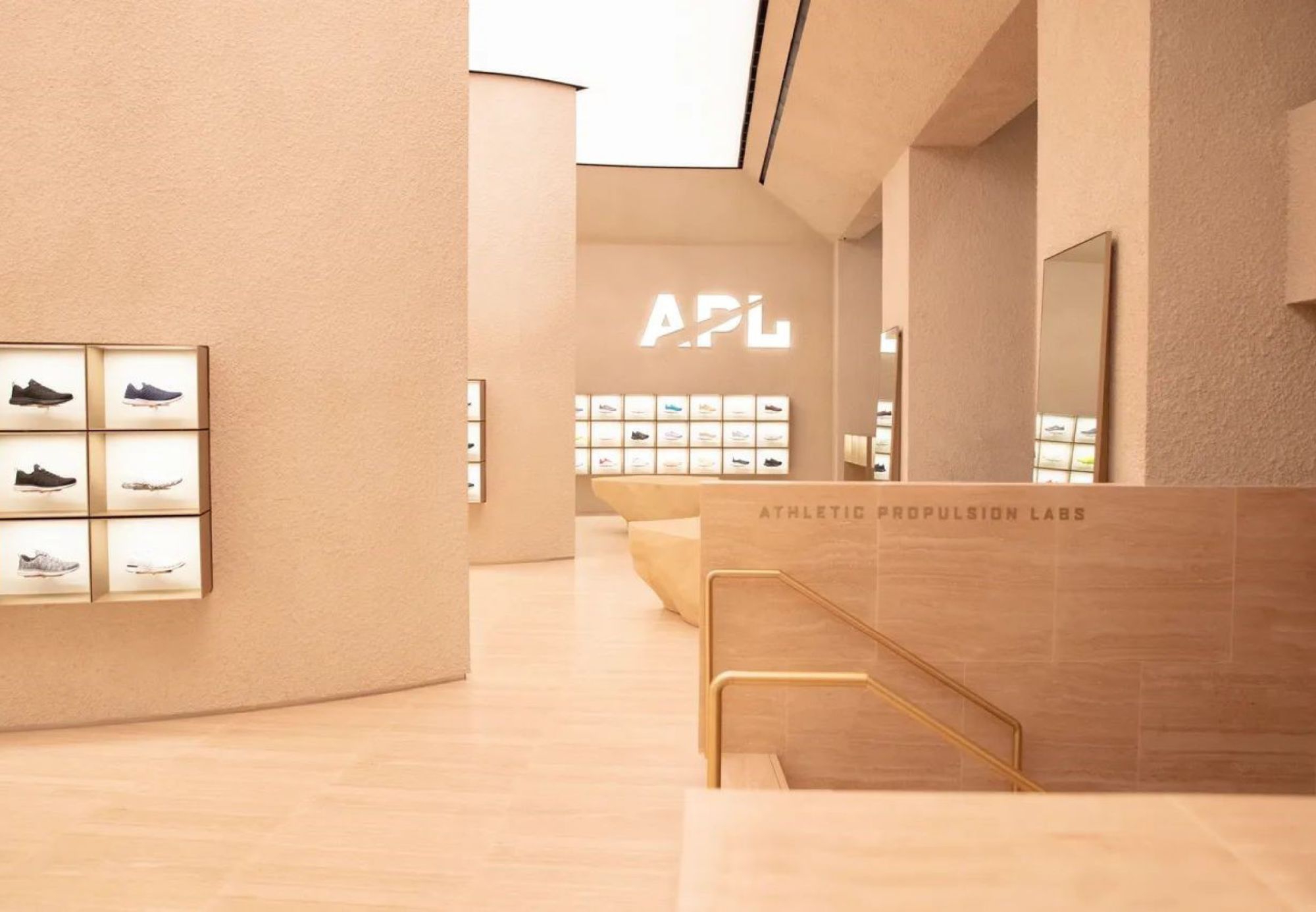 the design challenge for the boutique of apl - athletic propulsion labs, the high-performance sports footwear brand, was to create light display boxes that perfectly matched the complexity of the space and a lighting design that would enhance not only the products on display, but also the quality of the architectural project and the materials used in it.