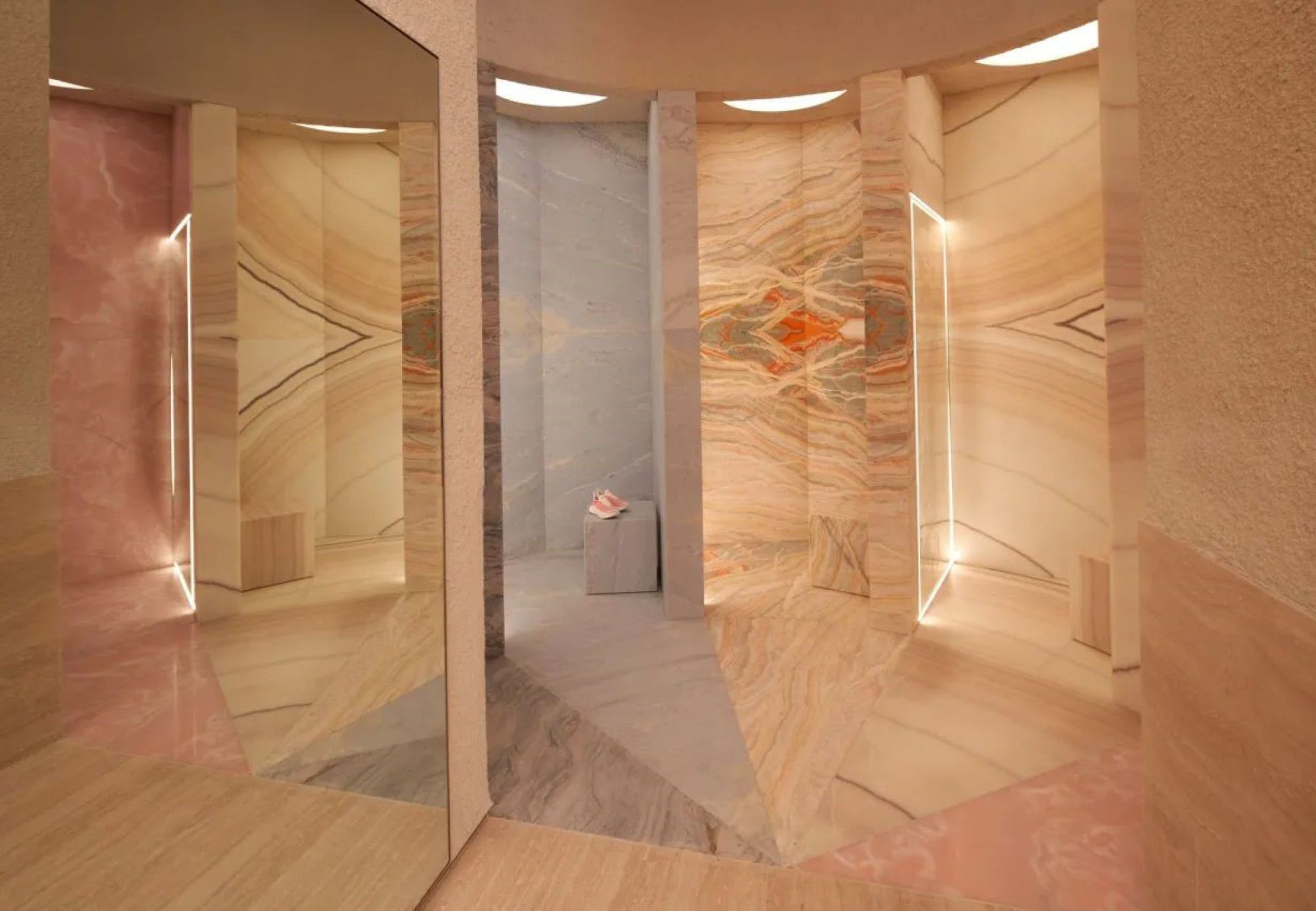 inside the fitting rooms, large mirrors almost two and a half metres high were illuminated with 13°angolo custom-made to be recessed into the marble walls, thus creating lighting appropriate to the space without detracting from the peculiarities of the architecture and materials.