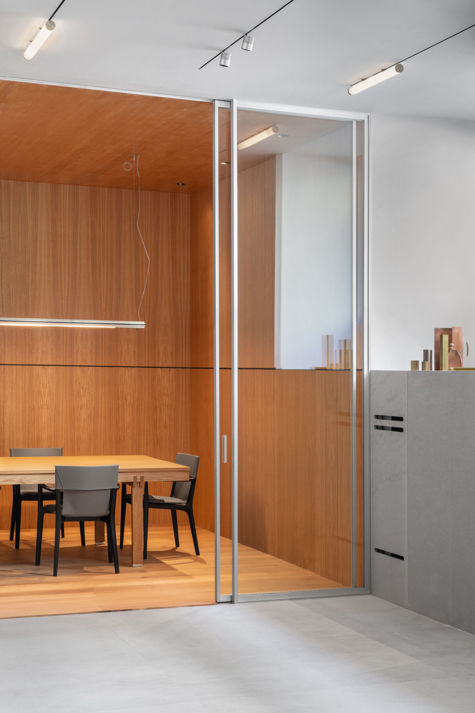entering the officine gullo space in milan means immersing yourself in a parallel experience and at the same time communicating with the outside environment. with these premises, the lighting design was developed as much to dialogue with natural light as to emphasise the idea of a space created by subtraction of matter.