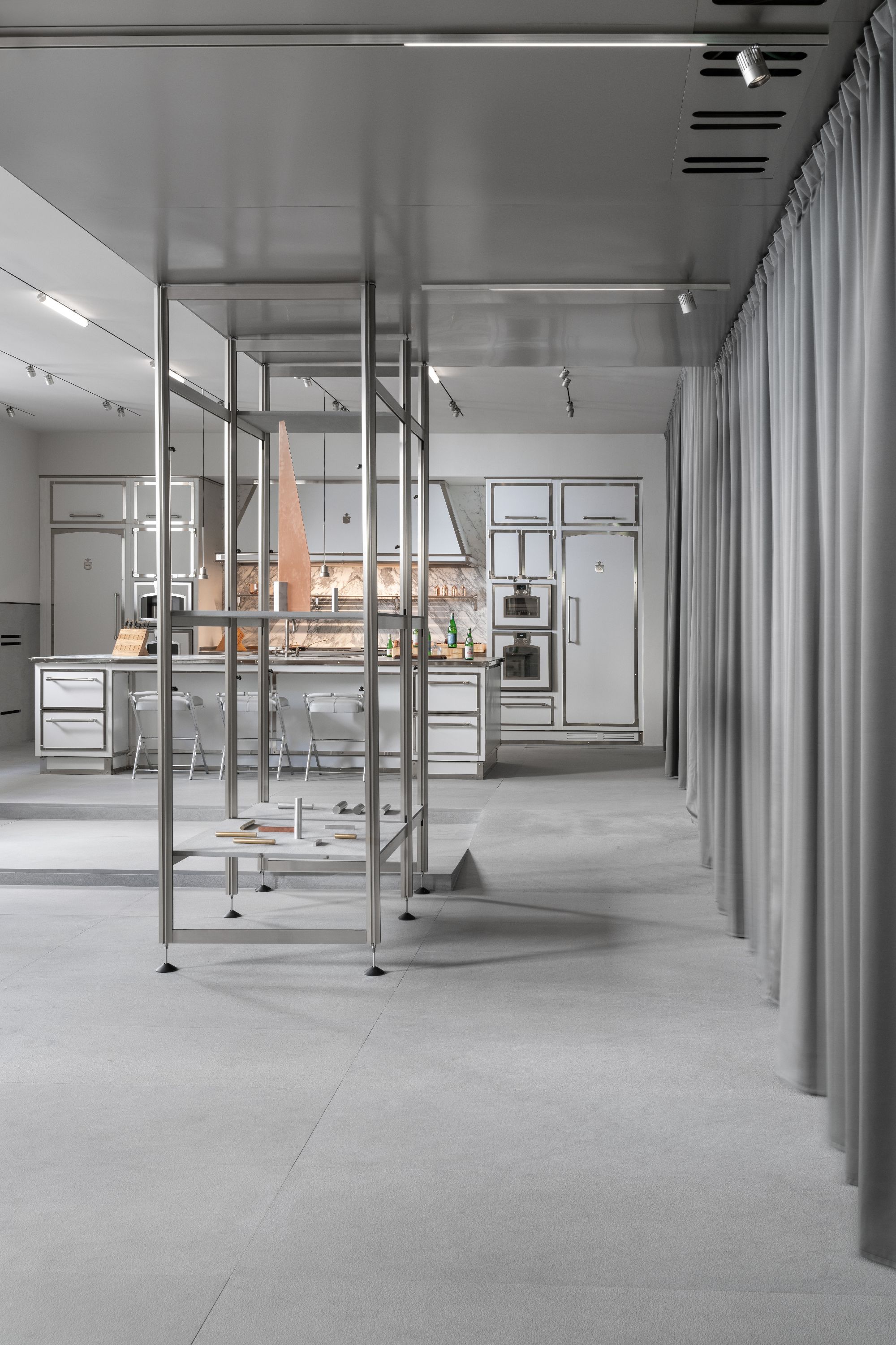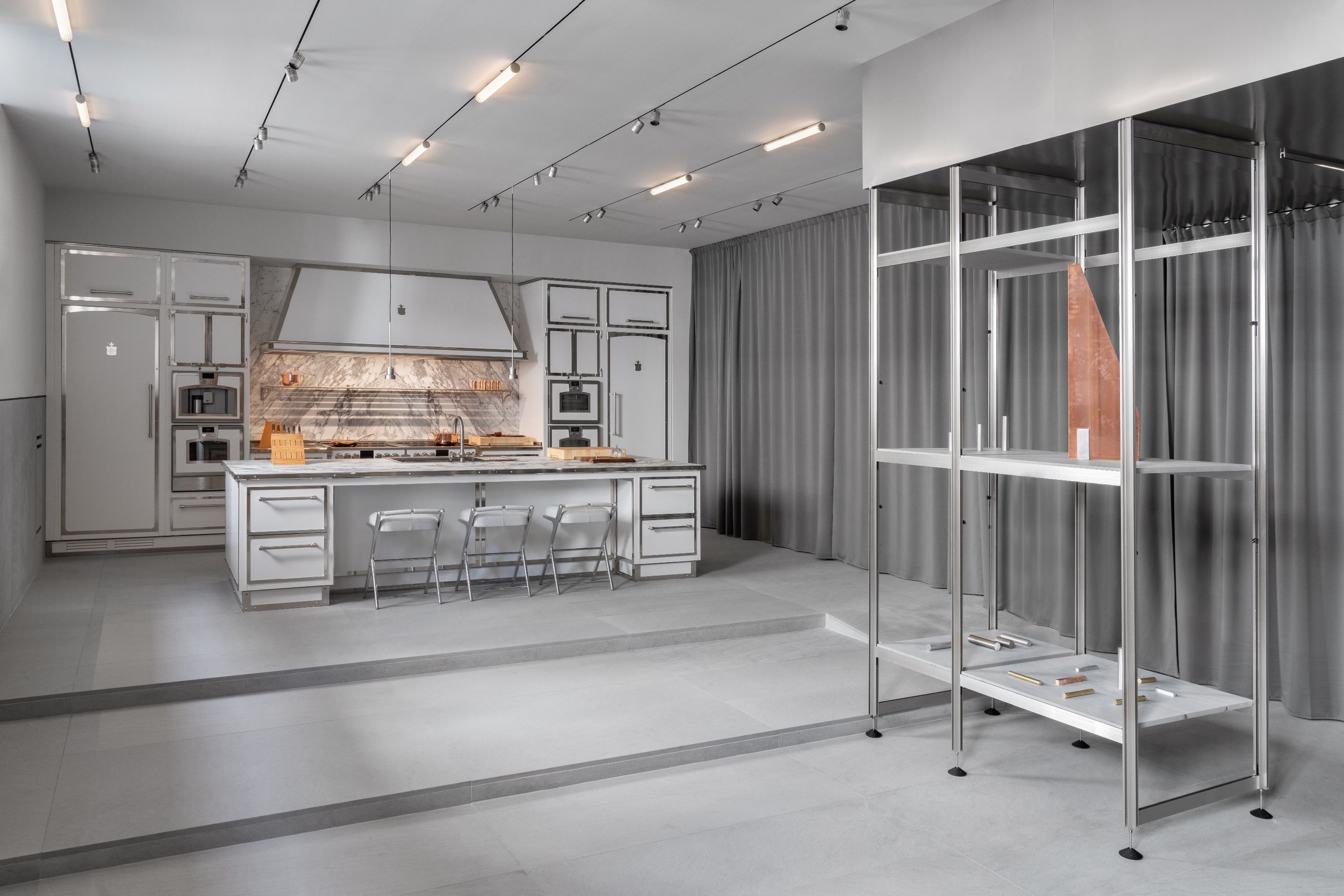 at the end of the tour there is a majestic bespoke kitchen, anticipated by a showcase structure built entirely with traccia sistema in which samples of materials and finishes are presented, illuminated punctually by micromen spotlights. conceptually, the two elements are related by the capability of showing the mastery in the creation of customised solutions in which functionality and aesthetic research contribute to the creation of unique elements.