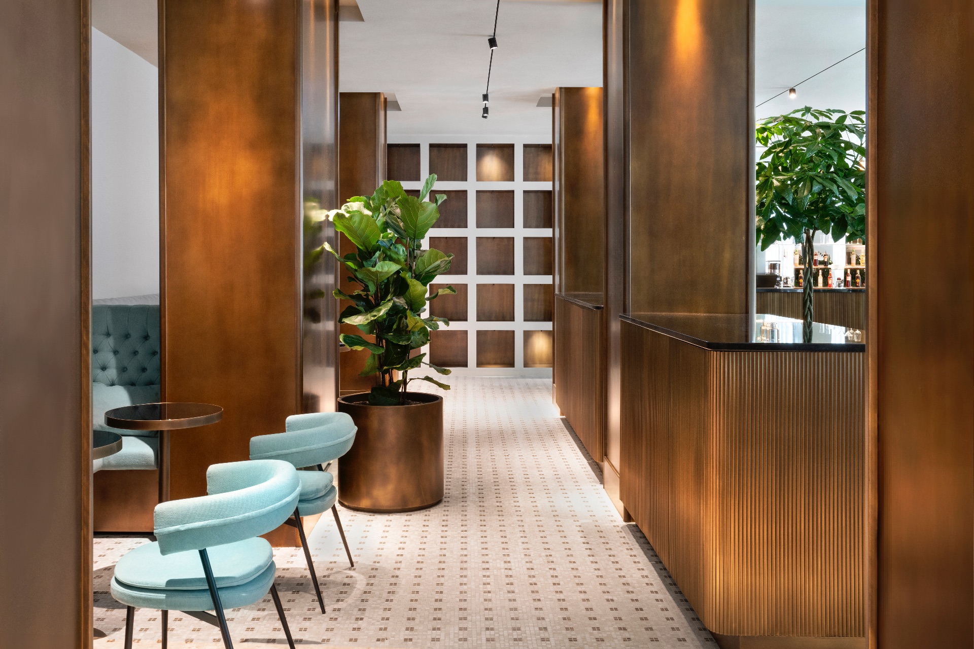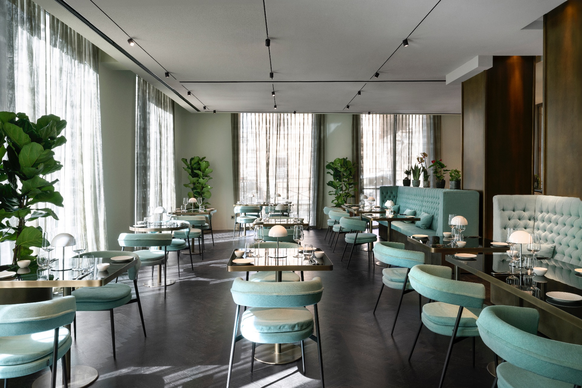 continuing into the restaurant and the lounge bar, the rooms are characterised by large windows overlooking the main street, from which people passing by can see the precious finishes chosen for these rooms. on the ceiling, clean lines of traccia sistema with ecomini spotlights cut the surface providing dedicated but not sharp lighting to each table, enhancing the colours and textures of the fabrics and materials of the furnishings. on each table a bulletta - designed by the architect mariano zanon for Viabizzuno specifically for this hotel - creates a more intimate atmosphere for guests.