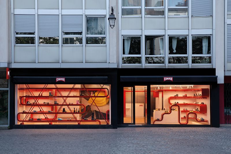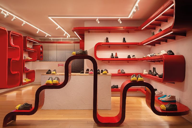 since its foundation, these elements have found their expression in different forms: from bold advertising campaigns to colourful shop windows, from mismatched shoes to stores designed in collaboration with leading designers. the latest flagship stores opened are located in two of the world’s fashion and design capitals: paris and london. at 4 rue aubry le boucher, practically opposite the centre pompdou, there is the iconic parisian shop renovated by jorge penadés, a designer who combines his mediterranean roots with the search for new solutions, materials and techniques. inspired by the geometries of the nearby cultural centre, penadés built a display structure that runs along the walls of the entire shop, in which the linear lighting with the cestal 45 led profile by Stealth Light, dedicated to the lively footwear on display, is perfectly integrated. the clean lines and walls are guaranteed, as all the cables are concealed within the structure itself.