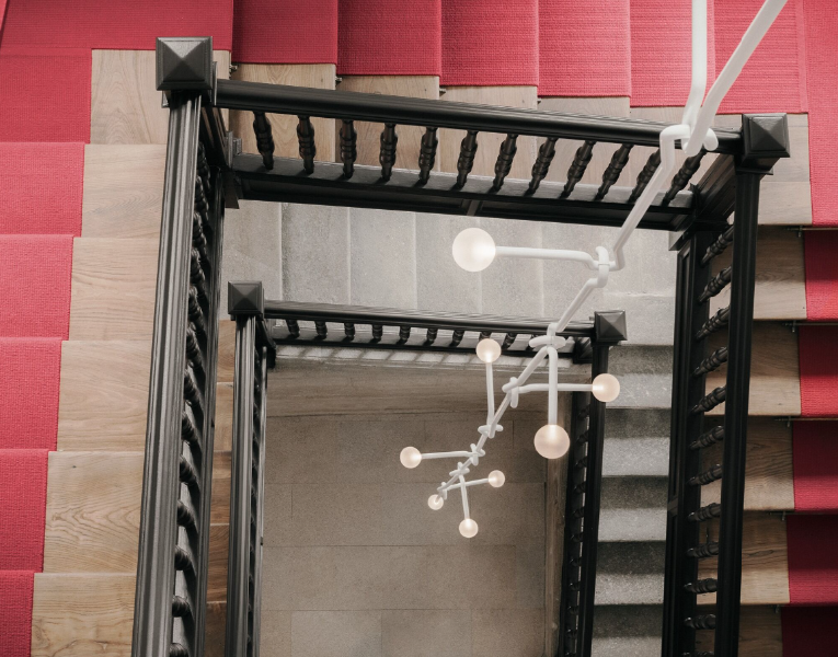in the stone and wood stairwell there is a special chandelier – designed by david chipperfield – composed of nine interlocking modules. a synthesis of chipperfield’s characteristic formal cleanliness and Viabizzuno’s advanced technological research, this suspension blends into the space and becomes a metaphor for the foundation itself: the encounter between local culture and sustainable development in the name of respect and mutual appreciation.