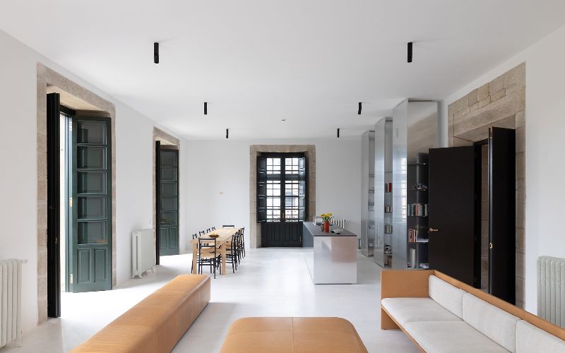 by a sandblasted glass and a structure with clean lines, creating a delicate and timeless light effect. in the halls, the original stone framing the windows dialogues