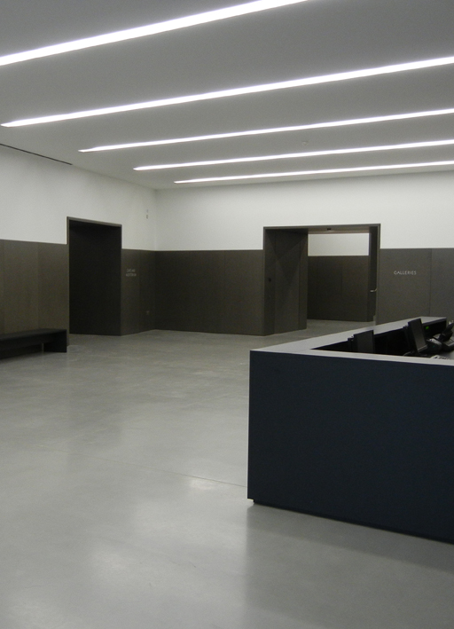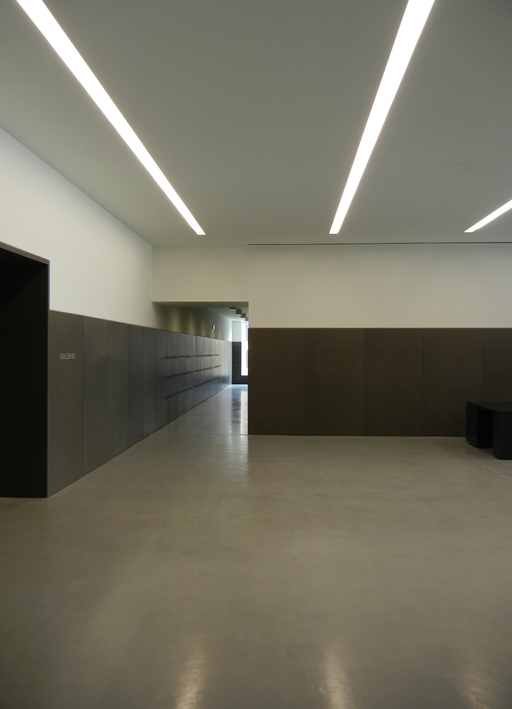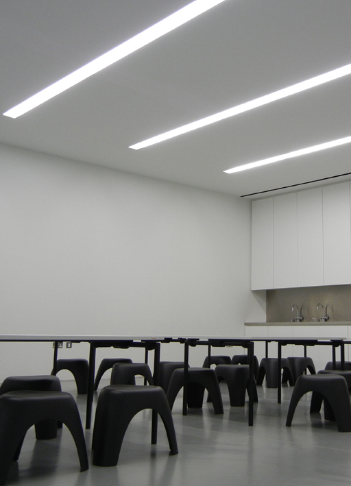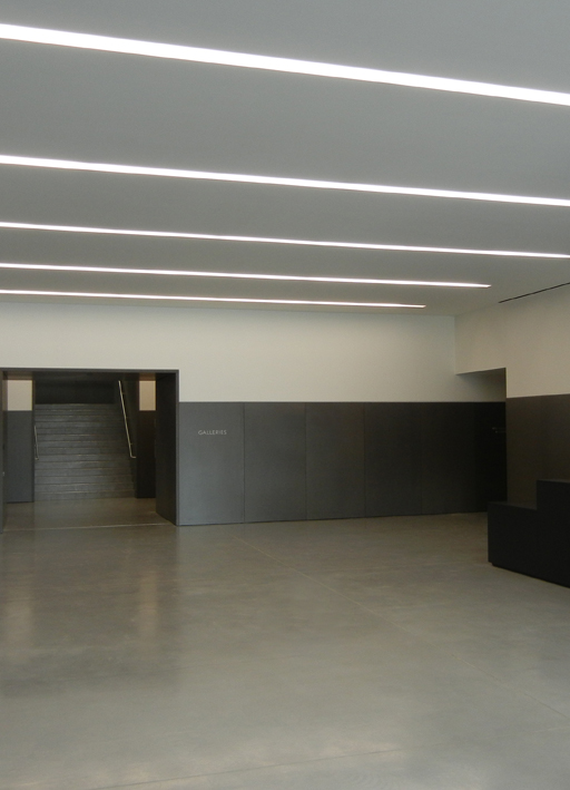the Viabizzuno 094 system, integrated into the building architecture, defines rooms, volumes, surfaces and contributes to design the space with light. a cut in the ceiling runs the whole length of the building, diffusing light towards the interior in each space of the gallery, to make the works the only protagonists of a neutral and clean space.