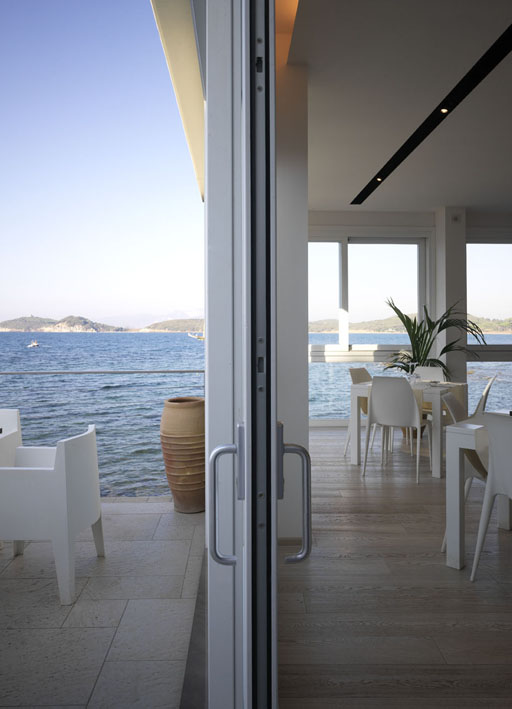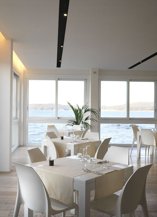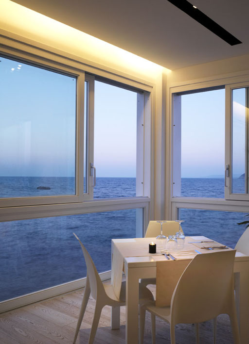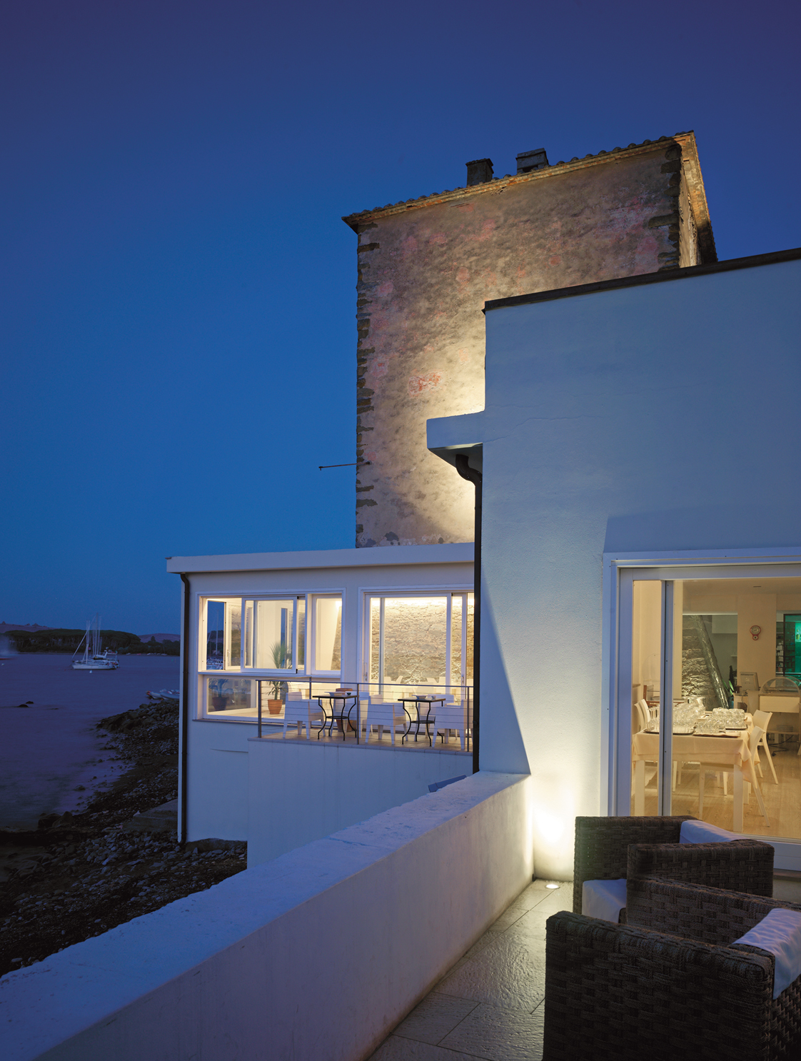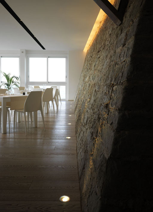 the object of the intervention is a building complex just a few metres from the sea on the furthermost stretch of the bay of baratti, comprising a series of structures dating from different periods, set around the original nucleus of a seventeenth-century watchtower. the guiding vision at the basis of the project begins with the intention of enhancing the architectural and natural characteristics of the place, by careful cleaning of the seventeenth-century tower and restrained introduction of new elements and materials. these interventions are intended to make one multi-functional space around the stone wall of the tower where the various functions (entrance, bar and lounge) are opportunely screened and separated by vertical and horizontal elements: plastered walls, panels in translucent sea-blue glass, false ceilings in plasterboard, and floors in bronze-coloured porcelain-finish tiles and bleached oak planks. the old stone wall becomes the heart of the project, the point of departure and arrival, the link and differentiation between the various elements, the essence of the entire space. the lighting project was specially designed to enhance the characteristics of this important architectural element: m44 fixtures recessed into the floor, emphasising the materials with horizontal beams of light; and a ceiling aperture which separates it from the horizontal structure but acts as a unifying feature by means of the light issuing from the aperture. if during the day a large plate glass window allows to enjoy a beautiful view over the gulf, almost like the floor is floating over the water, at dusk the gaze is drawn gradually inwards, until darkness comes and the body of the tower, opportunely illuminated with horizontal beams of light from floor and ceiling, is revealed in its entirety, once more taking the central role in this composition which had been lost for centuries.