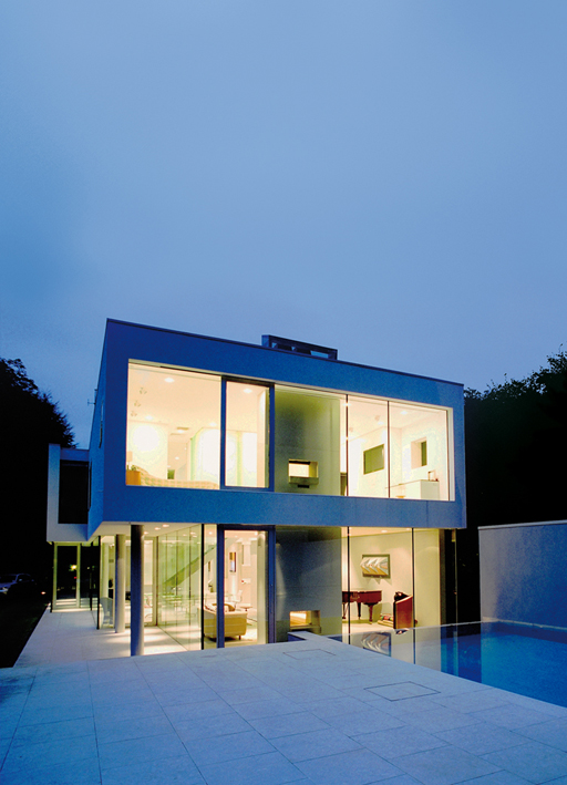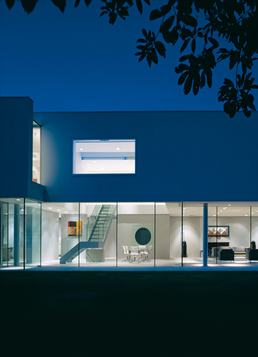 observing the building from in front, a picture window stretching the entire width of the house is in clear contrast with the dark grey bricks behind it. to the side, the glassed façade of the building opens the ground floor to the garden, thus giving the impression of almost infinite space. the lawns slope steeply upward from the reflecting waters of the swimming pool, ending only at the horizon. as regards the interior of the house, the open space on the ground floor divides naturally into three areas: the family living room, the combined hall and dining-room, and lastly the more formal music room/drawing room. in the hall, a glass staircase allows natural light to enter from outside. upstairs, on the first floor, a wide entrance leads into the hall from which open the five bedrooms, each one designed to offer privacy in relation to the surrounding houses. the lighting project was designed in accordance with the clients' request for lighting which could diversify the living spaces and the rigid architectural forms. natural light too plays a large part in the design of the building: on the ground floor, the huge glass wall allows light to flow in naturally and fill the entire space; on the first floor a series of large windows and skylights allow the light to flow in waves while at the same time preserving the privacy of the living spaces. completely recessed ceiling-mounted m6 fixtures have been used throughout on the ground floor. along the central walls, where the clients display their collection of material paintings by patrick huges, two light fittings have been installed in purpose-build openings so as to be switched on independently if desired. the lights are mounted along a carefully-designed grille traversing the entire round floor. intelligent use of the electrical circuit makes it possible to regulate the lighting throughout the ground floor either as one space or as separate areas. sitting in the living room and looking out beyond the swimming pool, you notice the contrast between the flames in the fireplace and the backdrop of water behind the glass, as though the glass reached beyond the edge of the swimming pool. a collection of works of art is displayed throughout the hall on the ground floor. a series of completely recessed lights, each supplied with two concealed light inserts, illuminates both the works of art and the route through them. in the hall, the series of ceiling lights mounted on the same grille as those of the entrance, preserve the architectural integrity of the ceiling, and with the addition of one single spotlight, light is concentrated on the dining table. in each bedroom the m1 ceiling fixtures light the main walls, and when seen from the garden, create the same symmetry as those of the ground floor, as they are mounted on the same grille. etched satin-finish glass is used to soften the lighting and create a tranquil atmosphere. the lights beside the beds and the indirect lighting, including some wall net, separate the change in light source and allow great flexibility in use of spaces. just as the first floor juts out from the glass surface of the ground floor, the ceiling lights follow the grille from the interior towards the exterior space, allowing the living spaces and the architecture to become one harmonious whole. the glass borders seem to disappear, and the house to commune with the greenery outside, simply resting against pilotis lit from above. moreover, behind the swimming pool, two cubo wall fixtures create a pillar of light which, by means of a complex play of reflections, gives the water the same texture as the wall. in the garden, by contrast, the atmosphere created by the lights is subtle, from time to time a tree is illuminated to give the observer an idea of scale and perspective. the exterior lighting is homogeneously diffused to avoid distracting attention from the true central element - the architecture of the building.