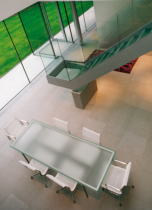 located in esher, surrey, this new building was designed by wilkinson king architects for a surgeon and his family. whereas their preceding house was a stereotype and gave no great importance to the relationship between light and space, the new building was designed to maximise the potential of the environment, so the comparison with the surroundings, characterised by huge trees, becomes a significant theme in the project.