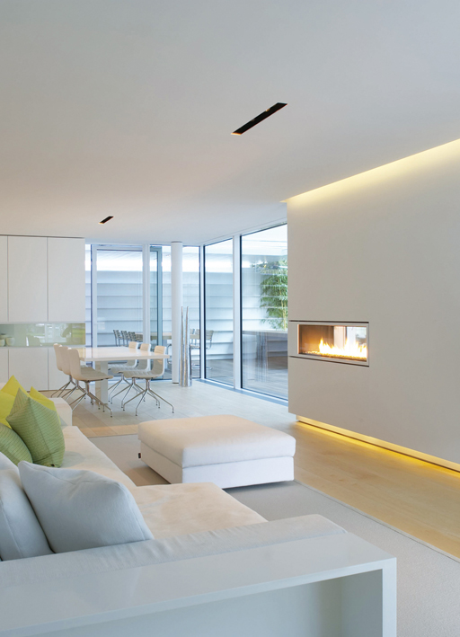 almost everything has been custom designed, including the kitchen, the tables, desks, and gas and wood-burning stoves. since maple is an unstable timber, the slats in contact with radiant panels were purpose-made using two 2.5mm thicknesses of canadian maple veneered onto chipboard. the 200mm width of the slats dictates the layout of all components, from walls to furniture. the garden is surrounded with a 2.5 metre high timber wall with prominent horizontals to emphasise the perspective and create a play of shadows and light from the sun throughout the day and from the light fittings buried in the ground, radiating light from below at night. the house is surrounded with ipe hardwood decking in 140mm wide slats, which also cover a sunbathing platform with inset jacuzzi and two cantilevered tables.
