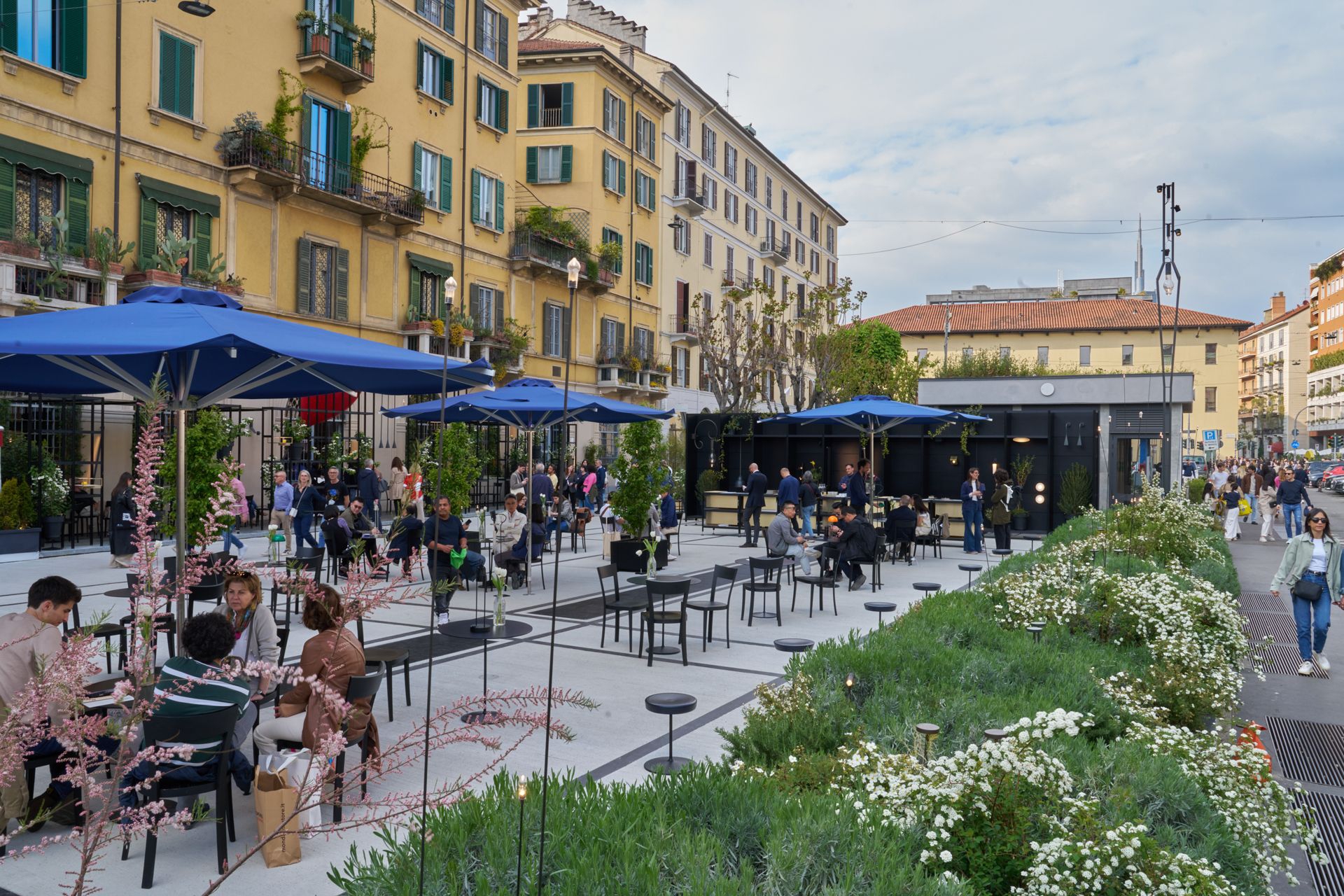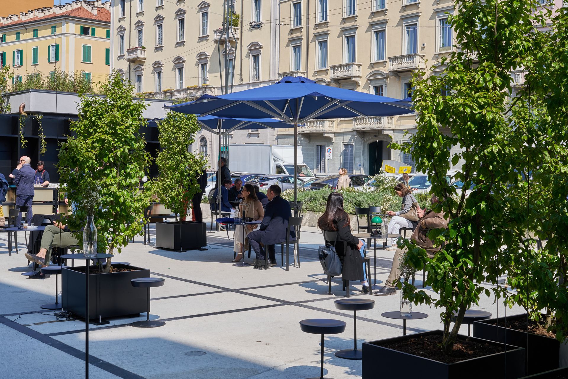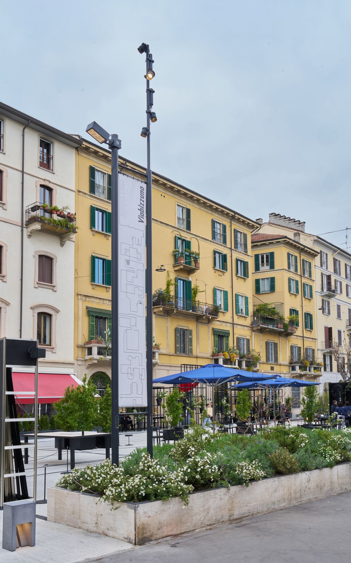 on the occasion of the milan design week 2025, Viabizzuno is focusing on a permanent work able to consolidate the dialogue between the Viabizzuno space in via san marco and the city of milan; a responsible choice, with the redevelopment of the vast outdoor area through the resurfacing of the pavement integrated with a new green project. marked by the big palo gonfalone that announces the entrance to Viabizzuno’s and the iconic palo lucus, the outdoor area of the light laboratory becomes a meeting place requalified and given back to the city of milan. some of the outdoor lighting solutions are presented there. above all, connections are created between the brand and the urban context, between light and people, in a virtuous circle of mutual enrichment.