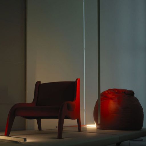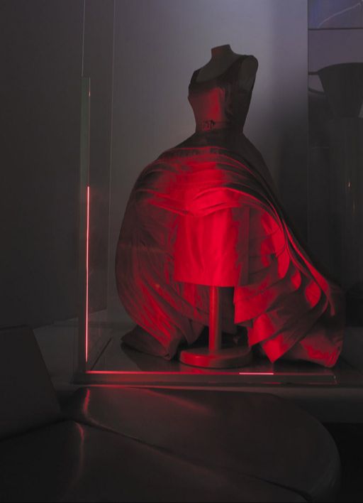 una gran pantalla en la que se proyectan siete películas corre a lo largo de todo el museo, iluminando con sus imágenes. los productos expuestos son los protagonistas y viven dentro de las películas gracias a una luz espacial. la luz del museo del diseño italiano es mutable, dinámica. una luz discreta que exalta la espacialidad de los objetos. las imágenes corren en la pantalla, los objetos son y viven dentro de la luz de la película. delgados cortes de luz rodean las obras y permiten que los visitantes perciban el espacio alrededor de las mismas. son signos luminosos que crean pequeñas habitaciones de luz, pequeños ambientes inmateriales en los que se incluyen los objetos.