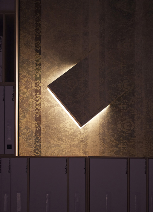 it's obtained an effect of a detached patch of wall that rises to reveal a niche in which the light source, protected by tempered glass, is concealed. the fitting can be applied either on horizontal or vertical surfaces.