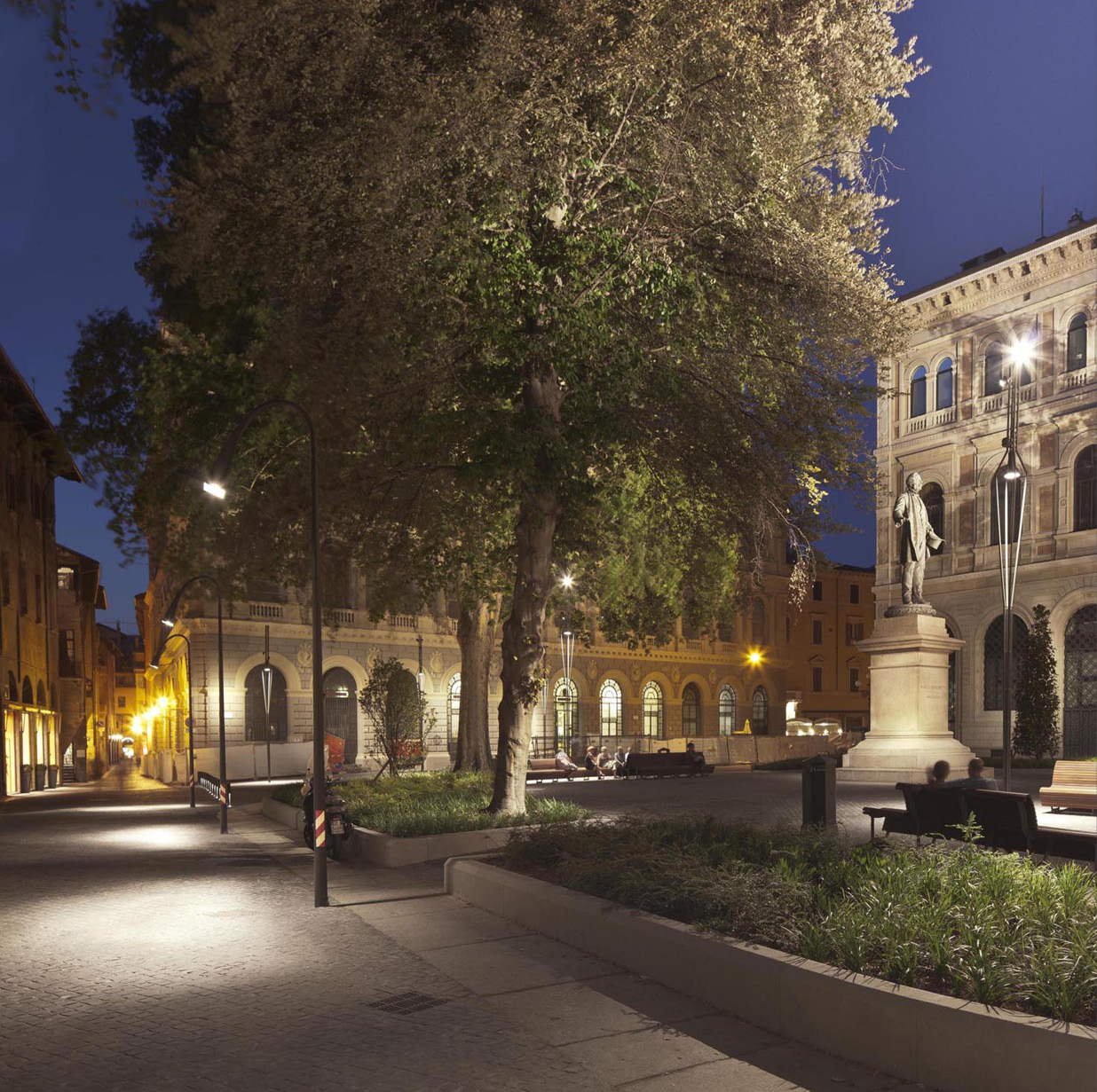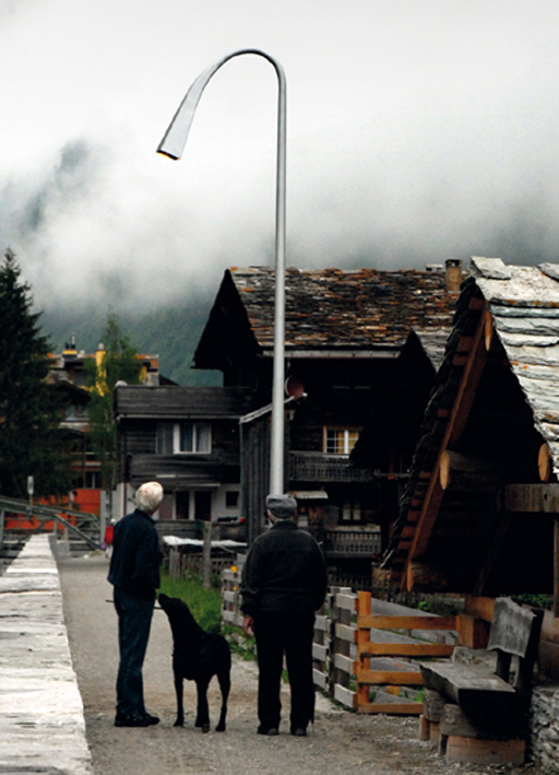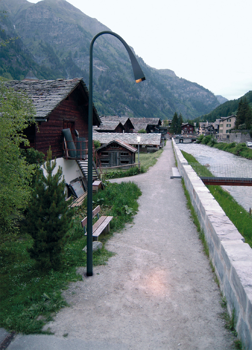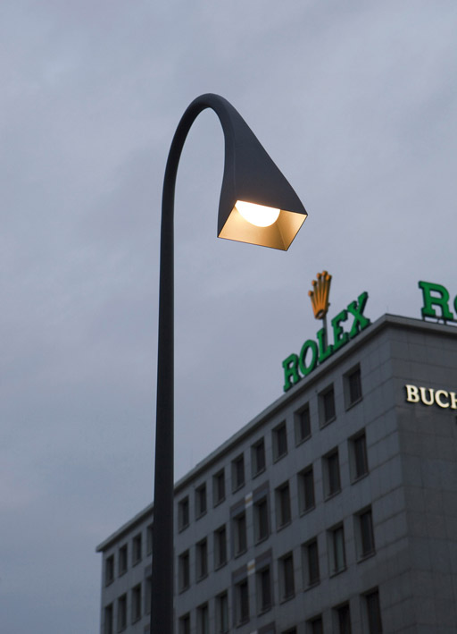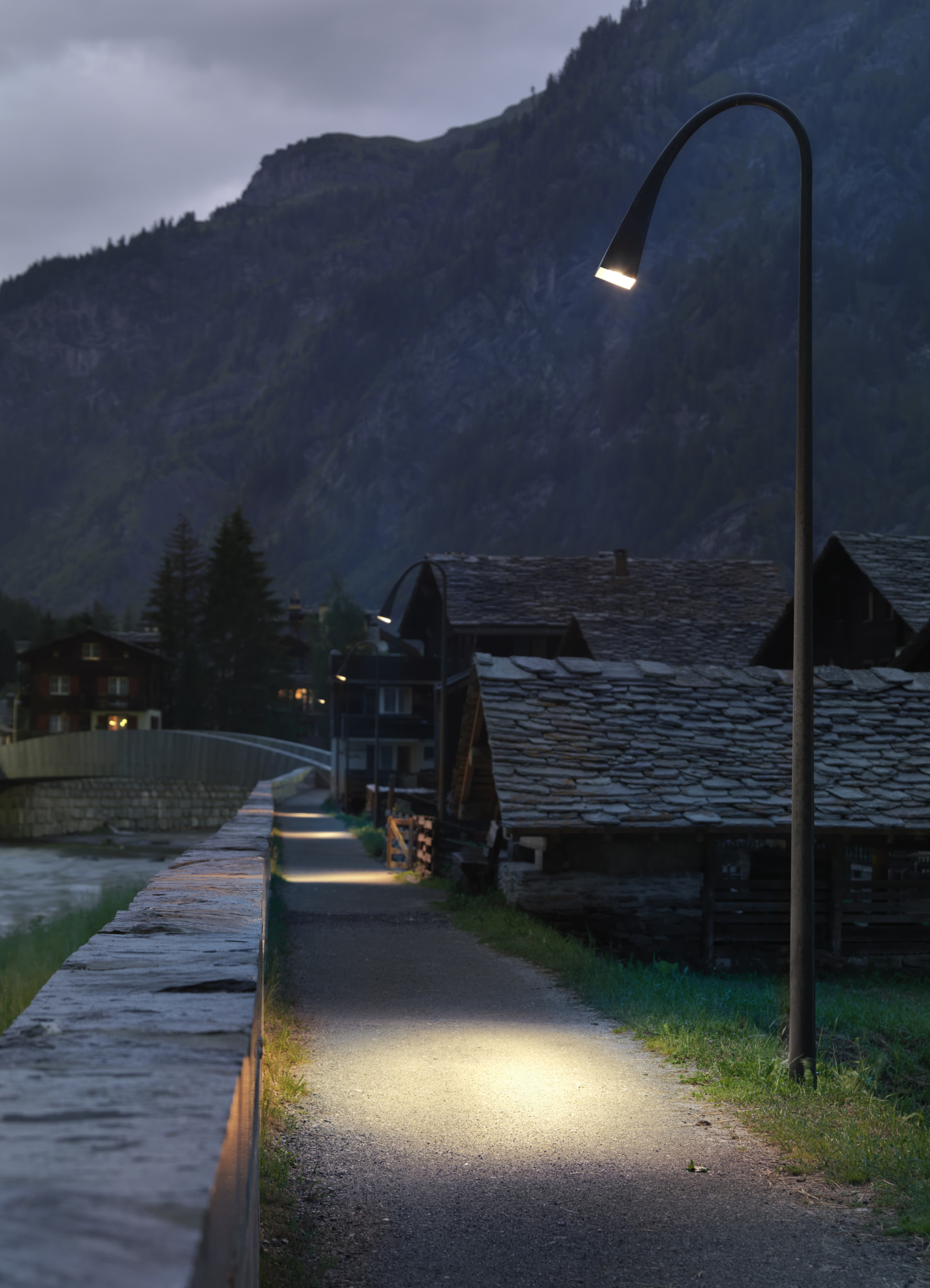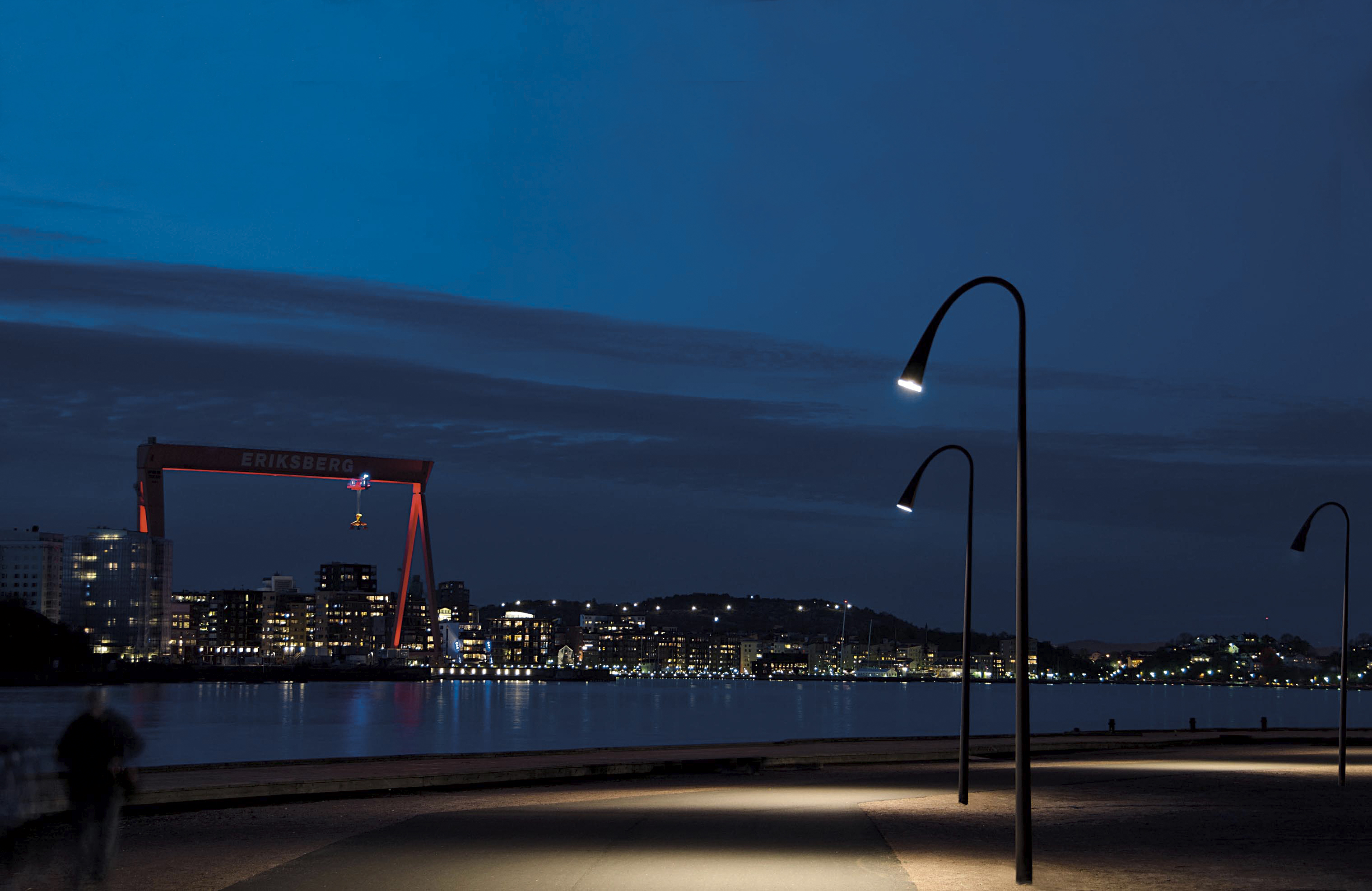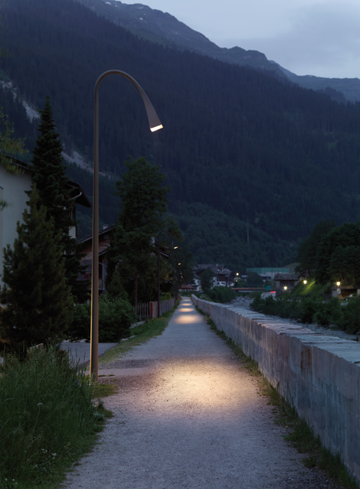 IP65 rated light fitting for outdoor use. made of powder coated drawn diameter at the base Ø153mm steel tube. the pole sized 1125x300mm and h.5200mm above ground is equipped with a fully concealed accessible terminal block and is made of a single element with a shaped end. wired with 3000K 43.5W 4812lm led source, with transparent glass 40x51° asymmetrical optics or with 66°x47° asymmetrical optics. 240V 50-60Hz power supply included. finishes: antique brown, night black, scurodivals and silver grey.