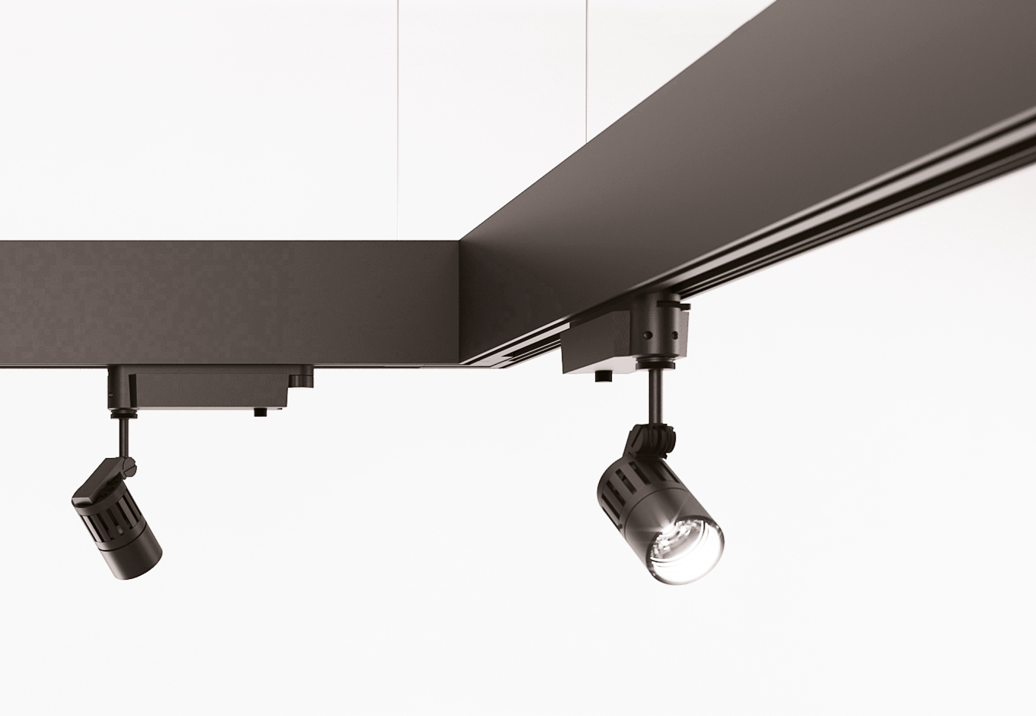 accabi sospensione (2000x2000m and 2000x3000mm) wholly wired with binario 3~230V (bottom groove) and Ra95 3000K 26W/m led source for indirect light (upper groove).