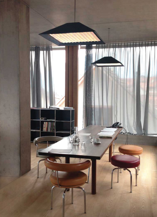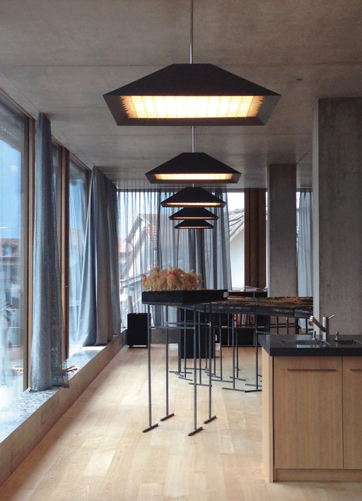 made of a powder and oxidised painted aluminium frustum of pyramid with a 1000mm chromed steel rigid suspension rod, anti-glare diffuser made of sanded natural brass louvres, frosted polycarbonate and diffuser lenses.