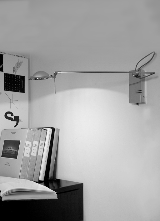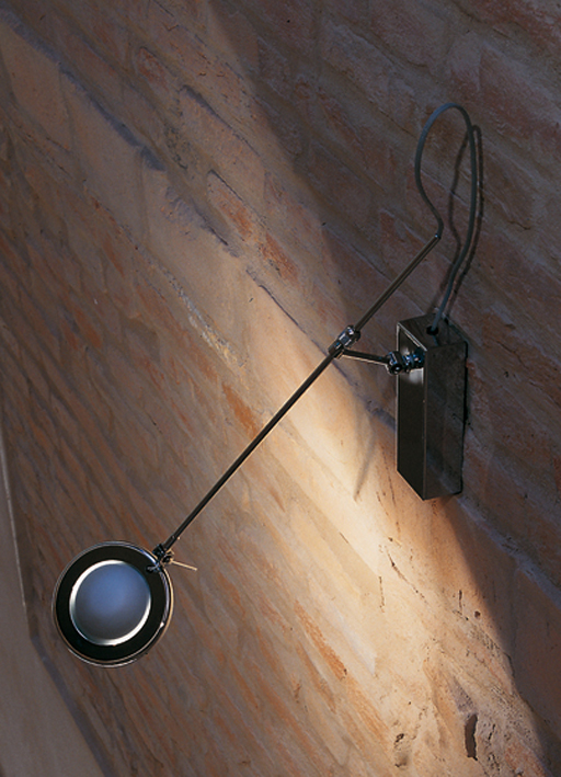 cuerpo iluminante de pared o techo para interiores IP20 realizado en latón oxidado, latòn natural, blanco, latòn cromado. provista de brazo telescópico y reflector parabólico orientable, equipada para lámparas halógenas GY6,35 de 90W, G53 AR111 de 75W con reflector de aluminio, led AR111 se suministra completa de transformador y regulador para el control de la intensidad luminosa.