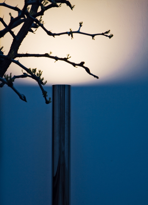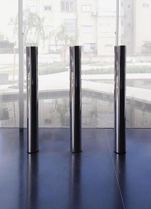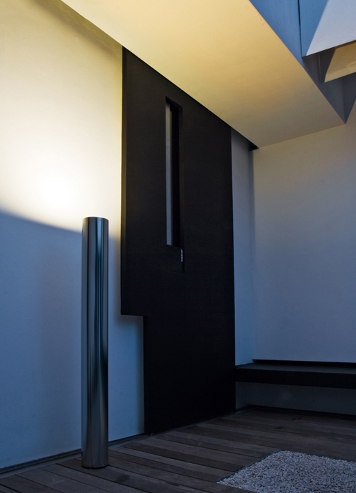 cuerpo iluminante de pie para interiores y exteriores de acero inoxidable brillante con cristal arenado IP44, equipado para lámparas de vapores de halogenuros con conexión G12, lámparas fluorescentes GX24q-4 42W, o kit halógeno B15d 150W. puede servir de lámpara de emergencia si se utiliza el kit flúo+emergencia GX24q-3 26W.