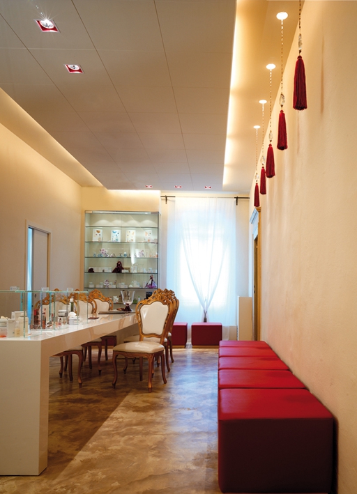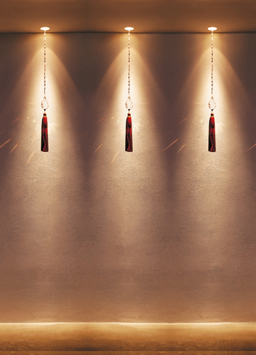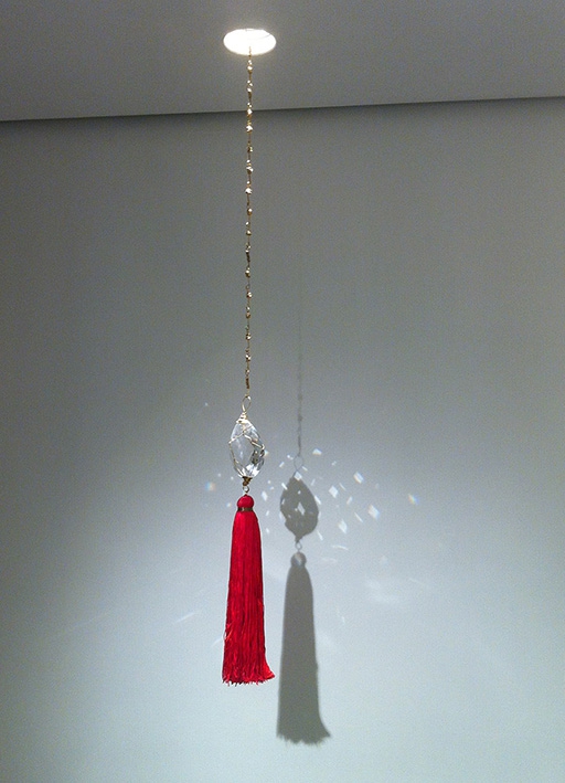 components: fully concealed housing; crystal, made of an handmade brass wire, bohemian crystal and red pendant; nylon thread, with a clip at the bottom end for supporting