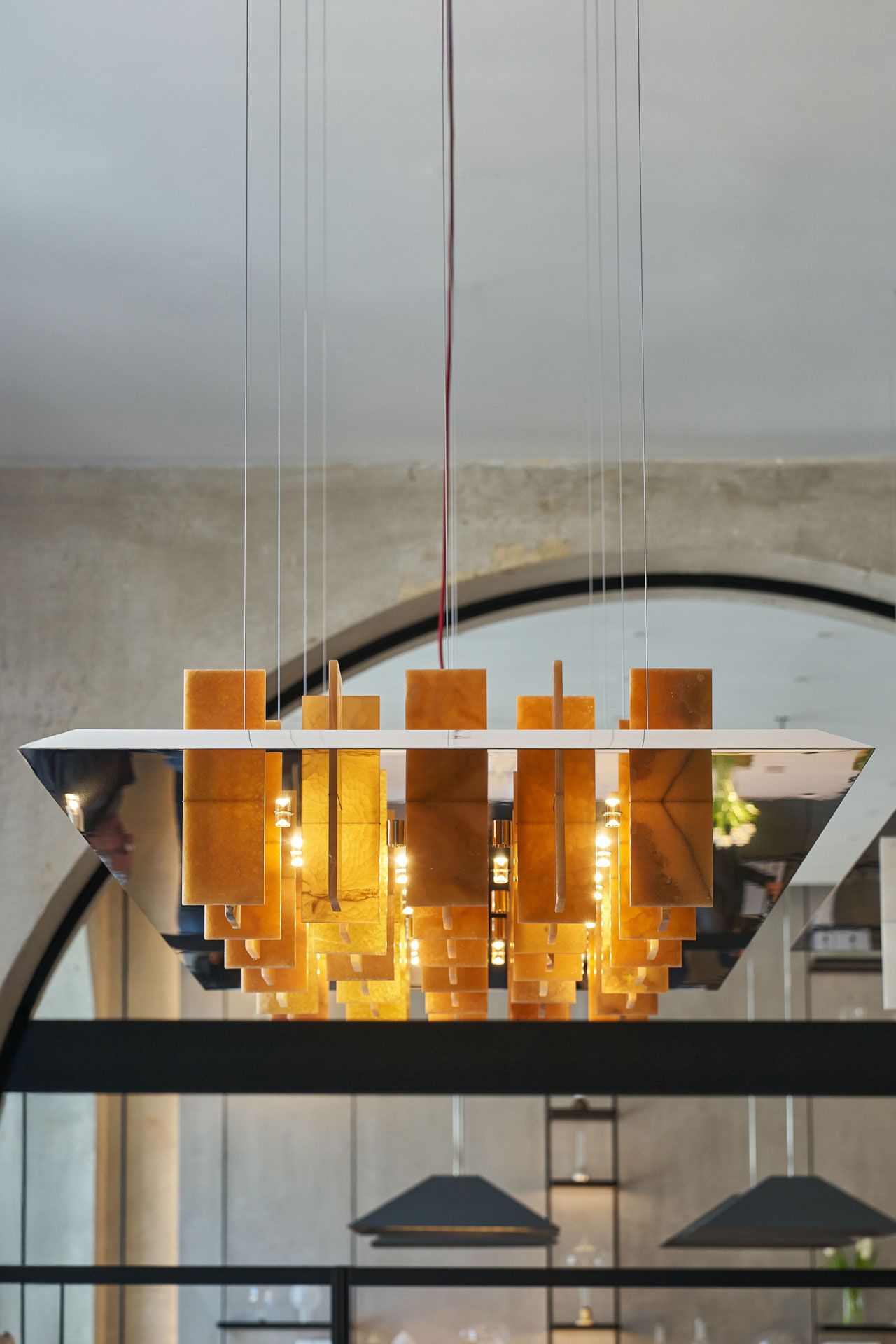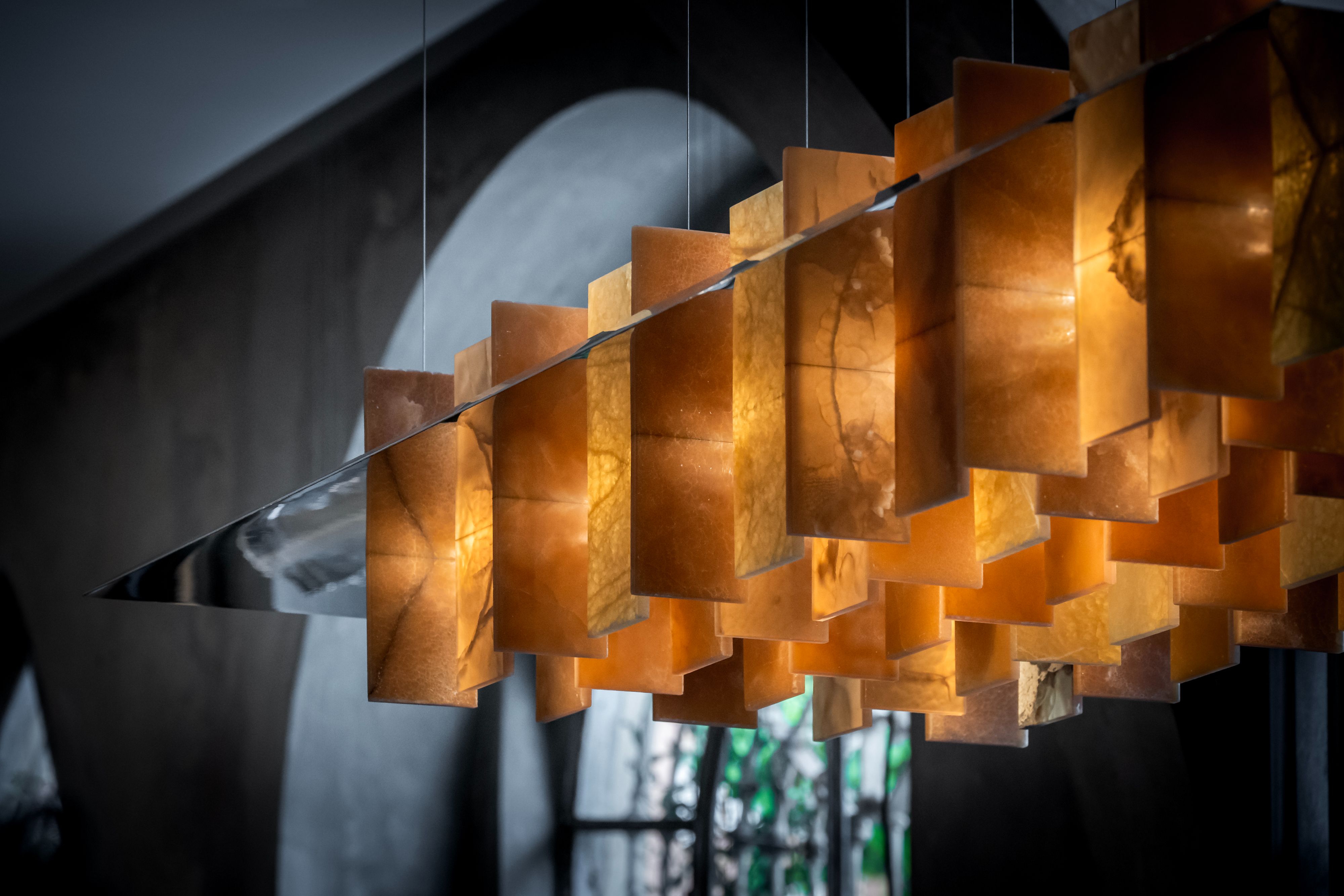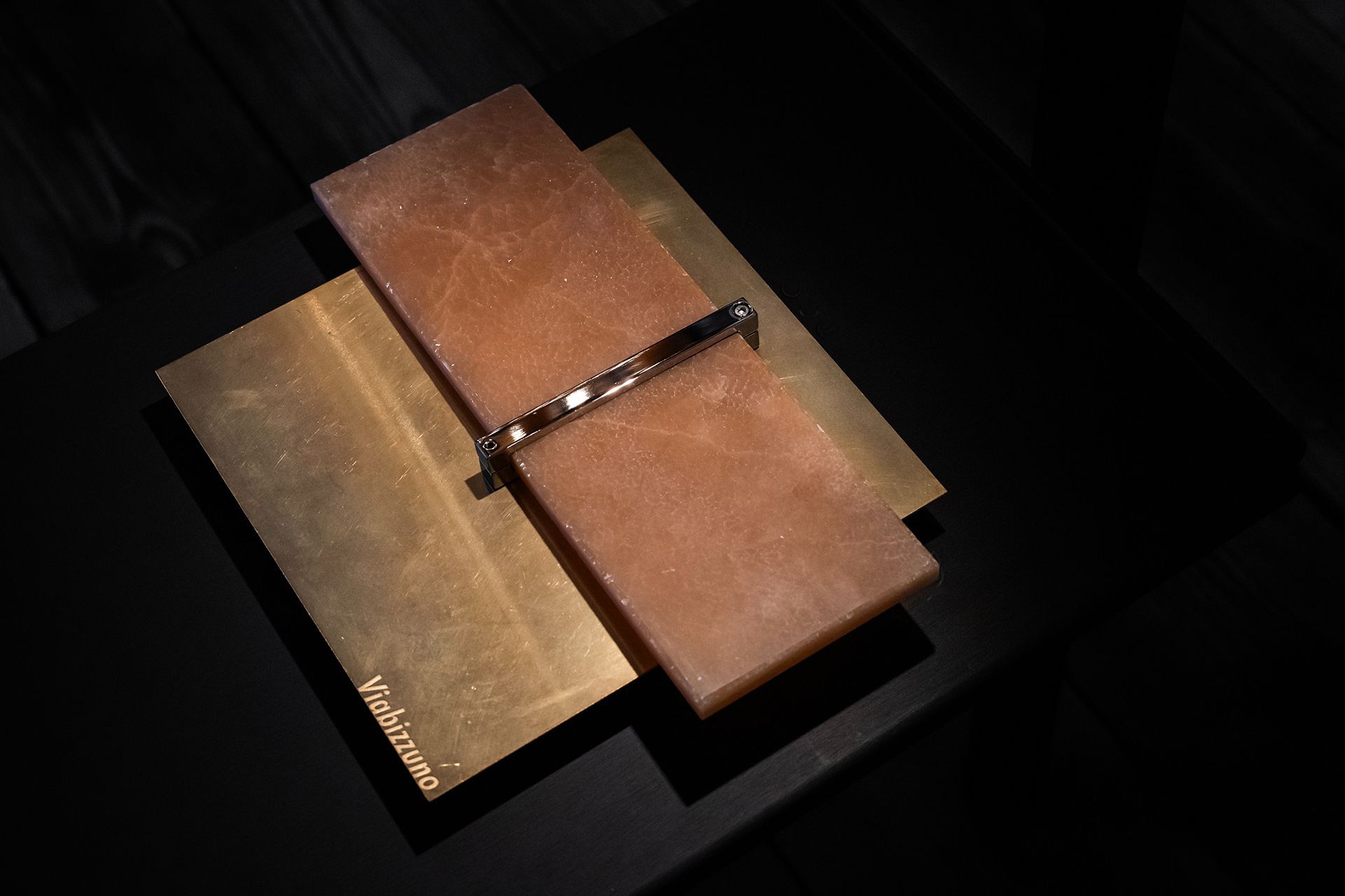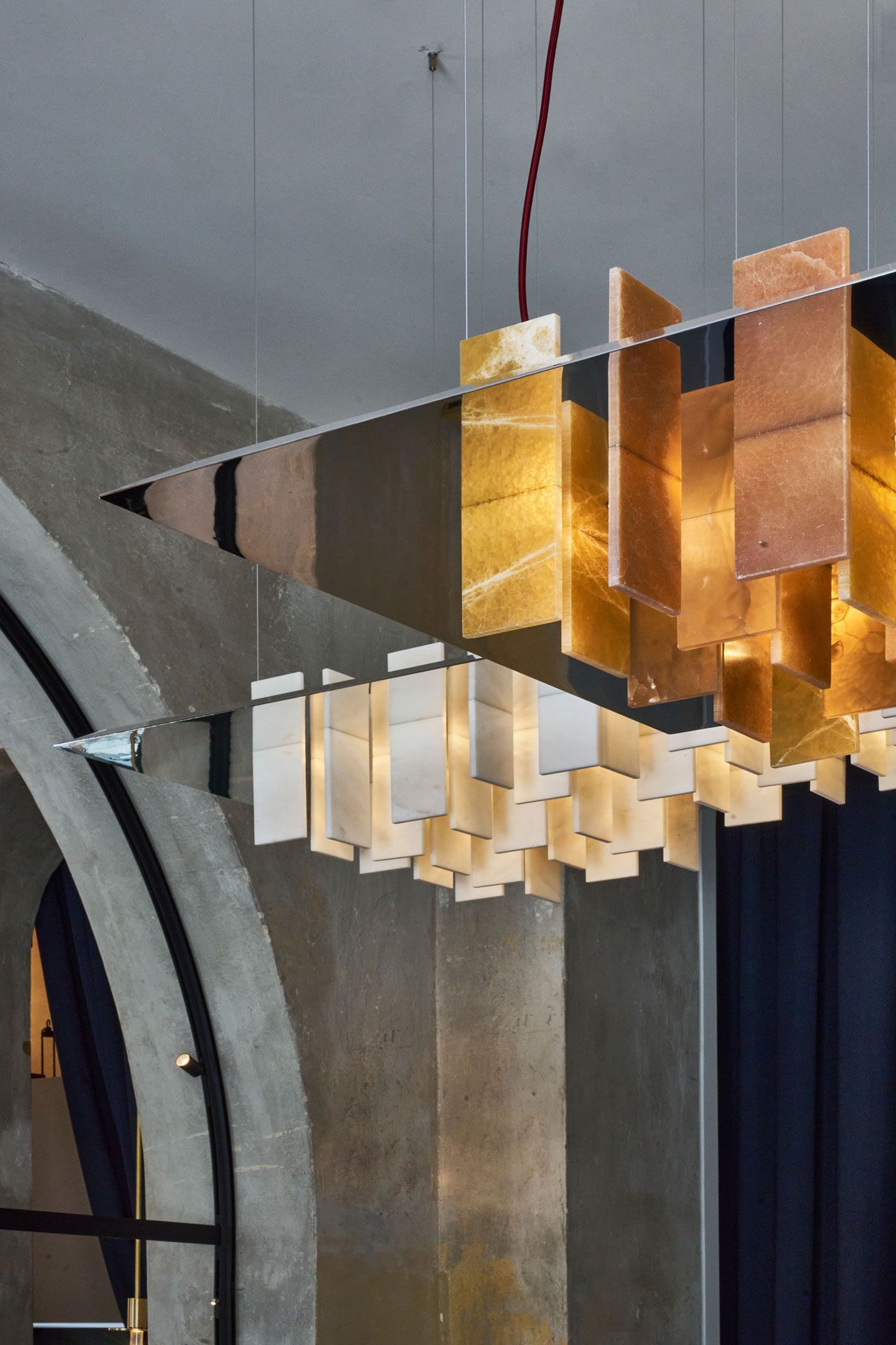 made of polished aluminium and onyx and polished aluminium and pink marble.