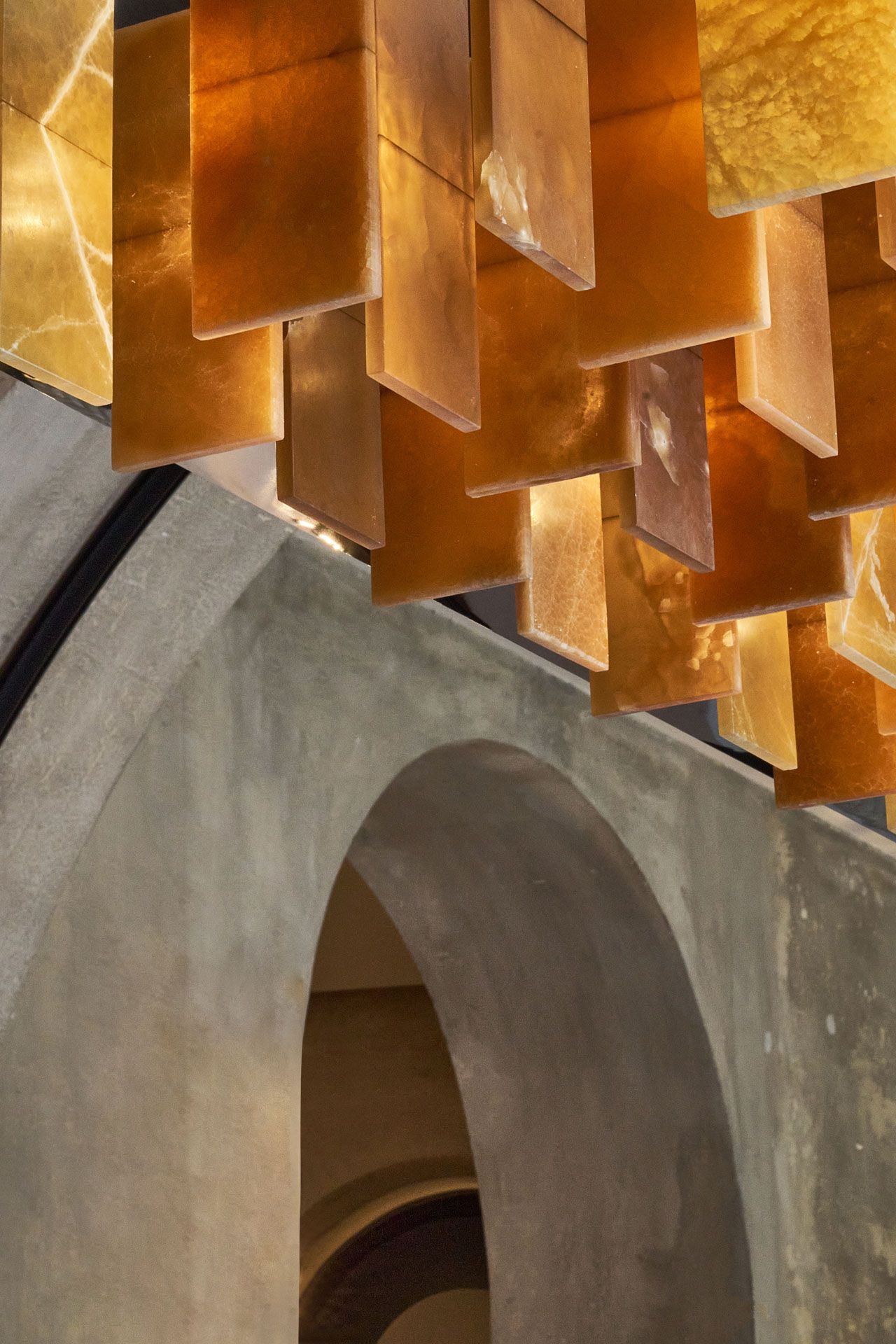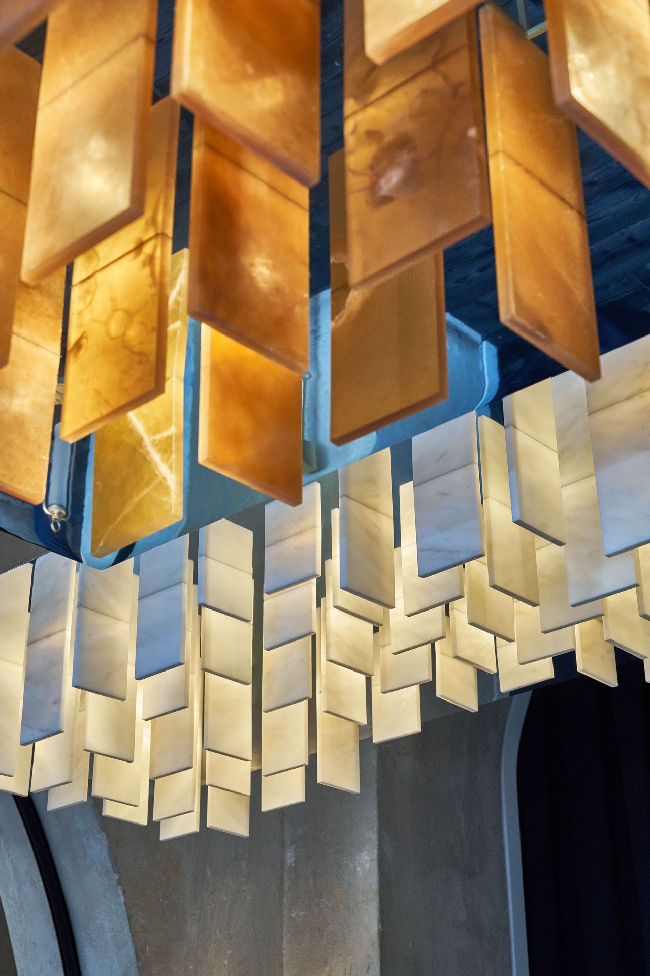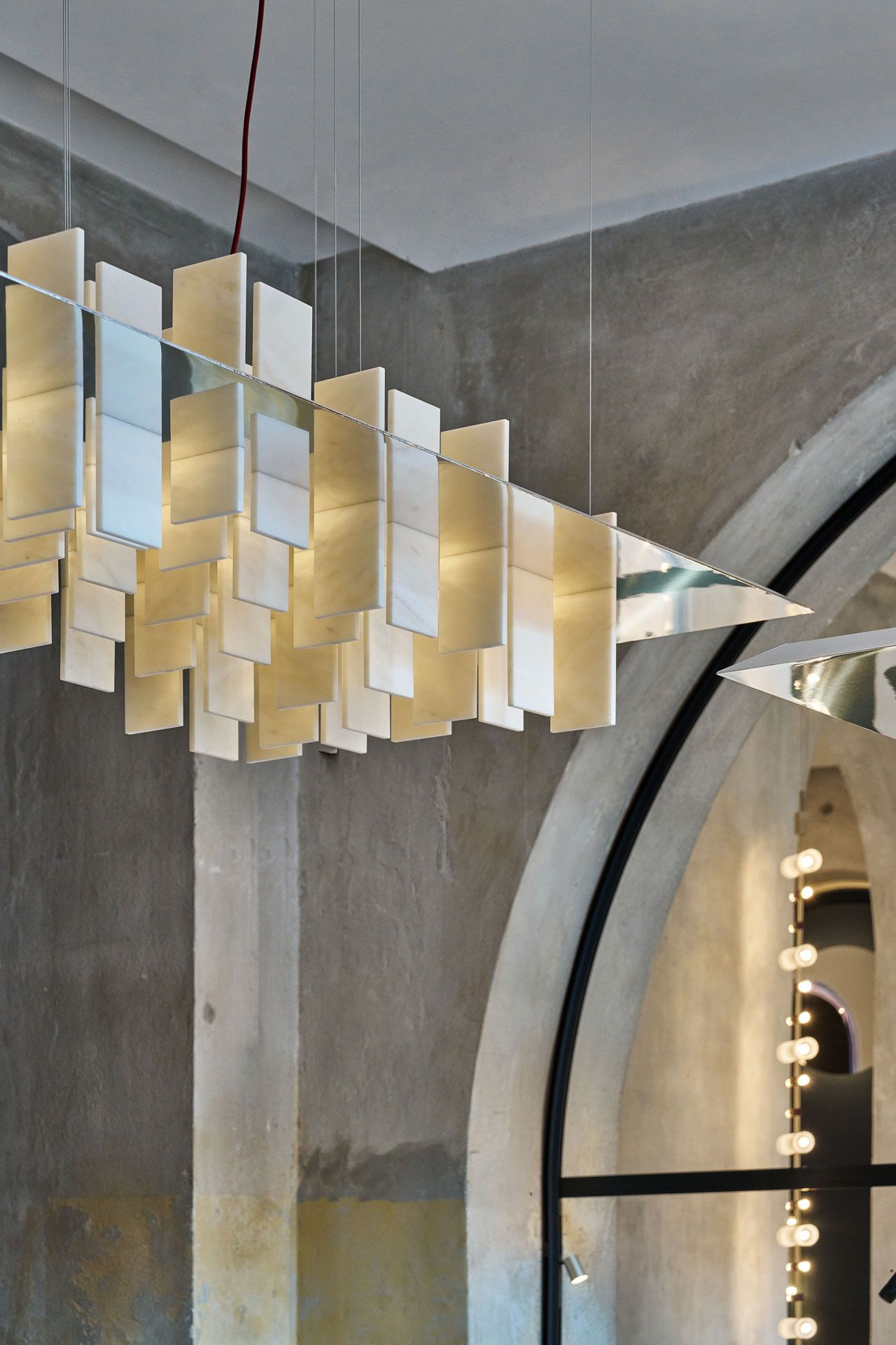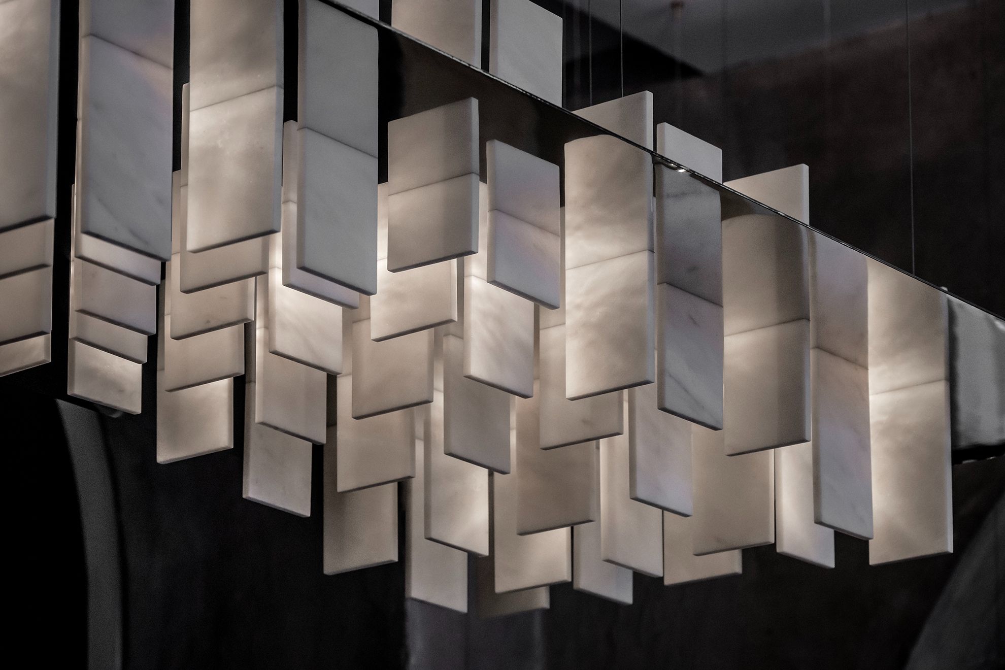 made of polished aluminium and onyx and polished aluminium and pink marble.