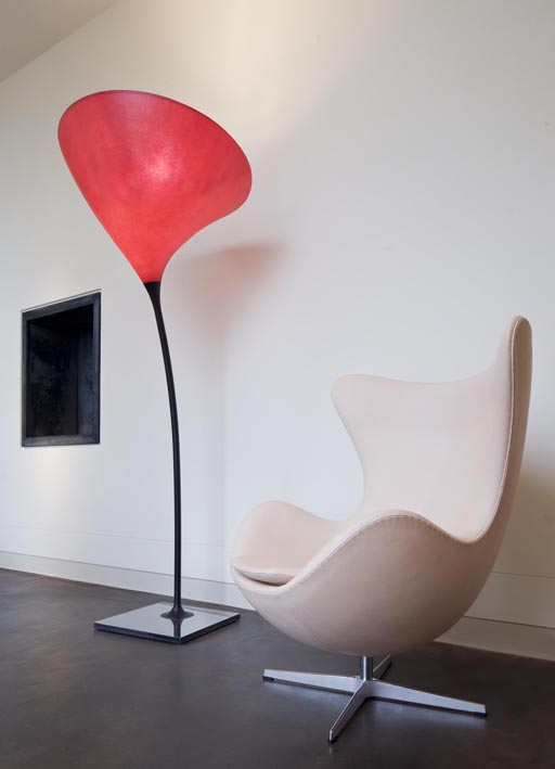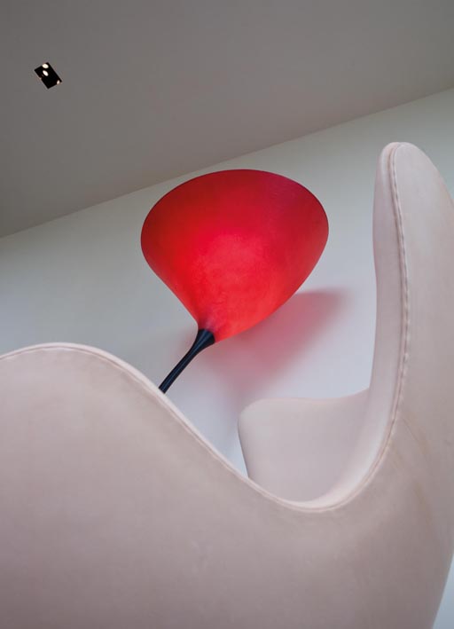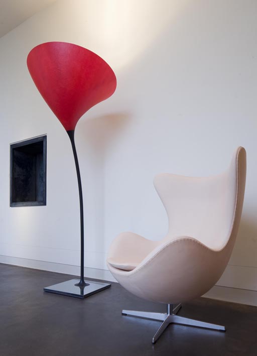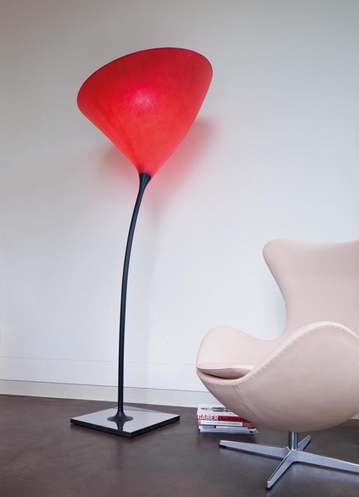 made of a fibreglass diffuser with a 760x840mm elliptical section, a h.2040 oxidised aluminium rod and a 450x450mm powder coated steel square base.