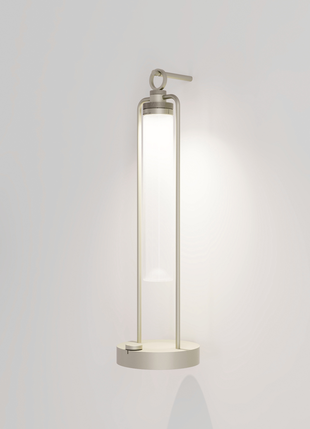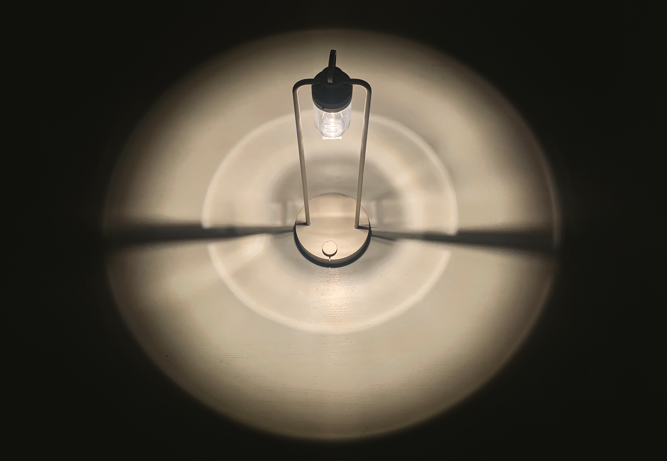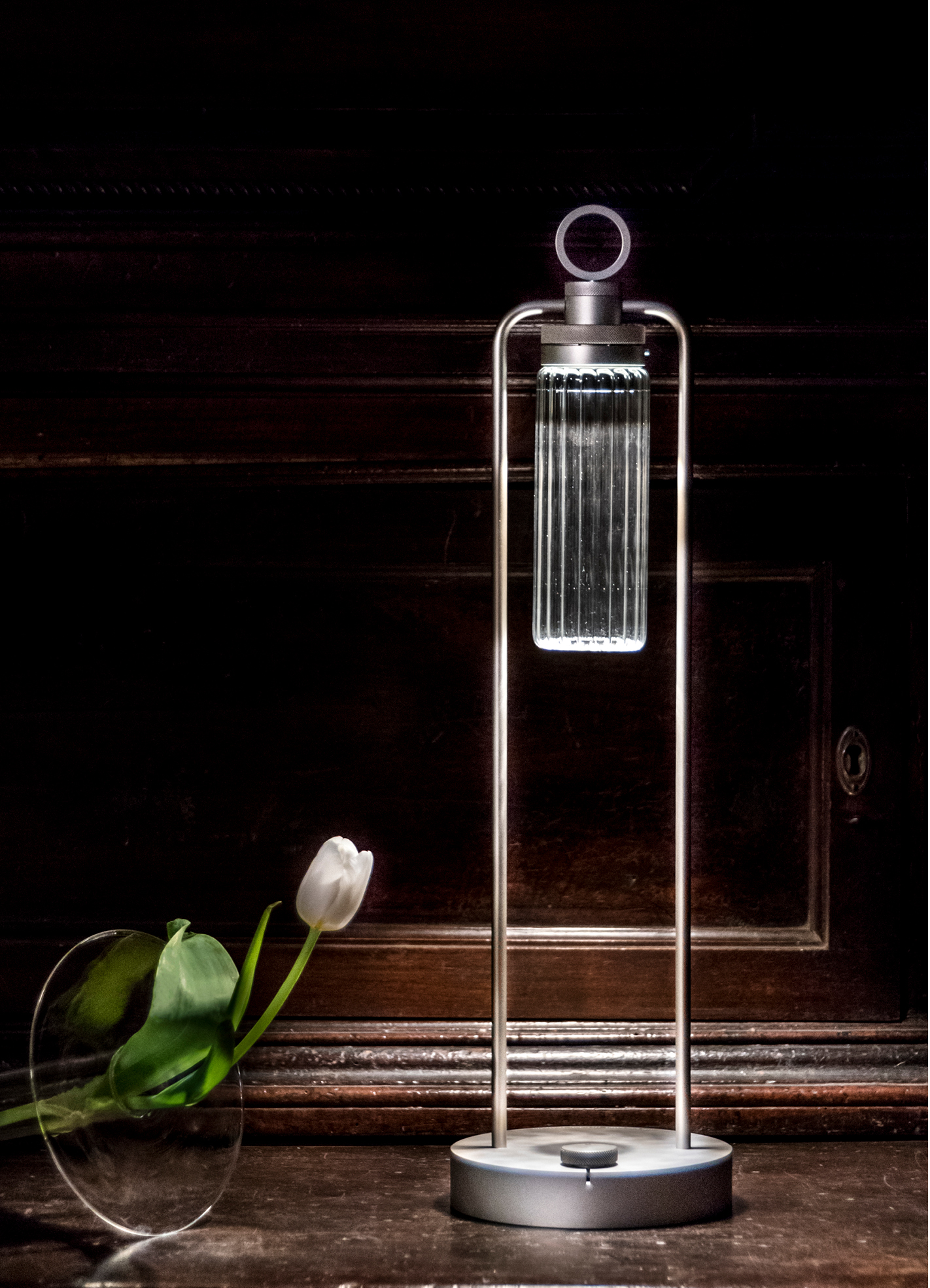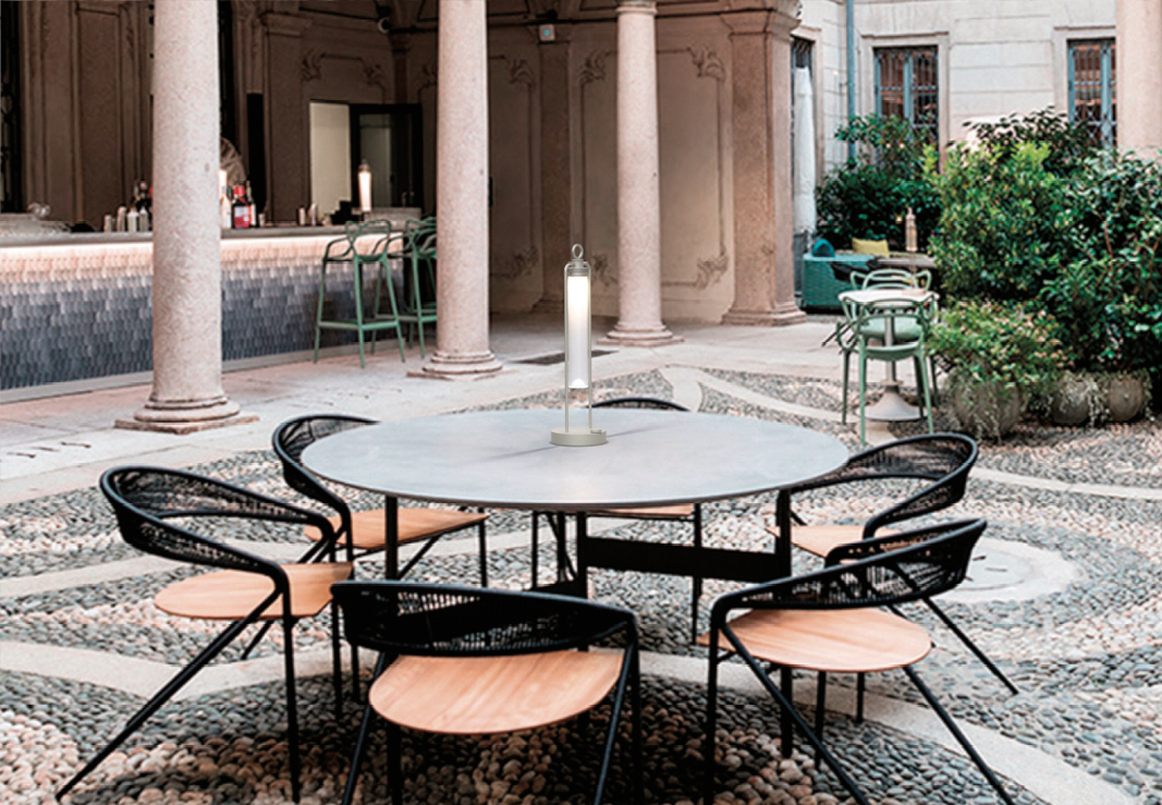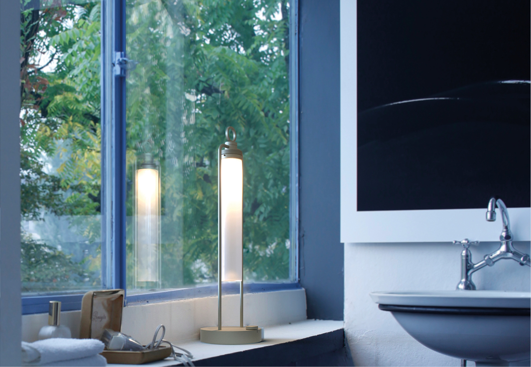 IP20 rated portable and rechargeable light fitting for indoor use. made of oxidised aluminium, with a Ø150mm base in which the battery is installed and on which two h.529mm rigid rods are installed; the rods support n55 system heat sink that rotates by 180° on the horizontal axis. wired with 2700K 3.9W 355lm led source. available with dc01, dc02, kk01 and ajp01 decorative diffuser for diffused light or spot55x61 15° and spot82x79 37° technical diffuser. any irregularities in the glass are a guarantee of an unique product, blown and entirely hand crafted by master glassmakers. 10 hours battery life, 12 hours recharge time, 100-240V/20V usb-c power supply with plug included, wall hanging kit. accessories: wall hanging kit. finishes: argento hacca, nero55.