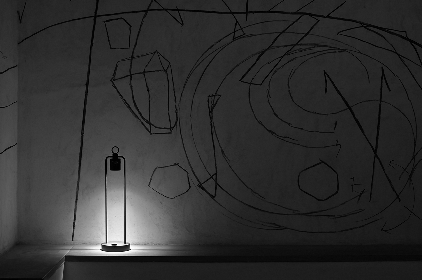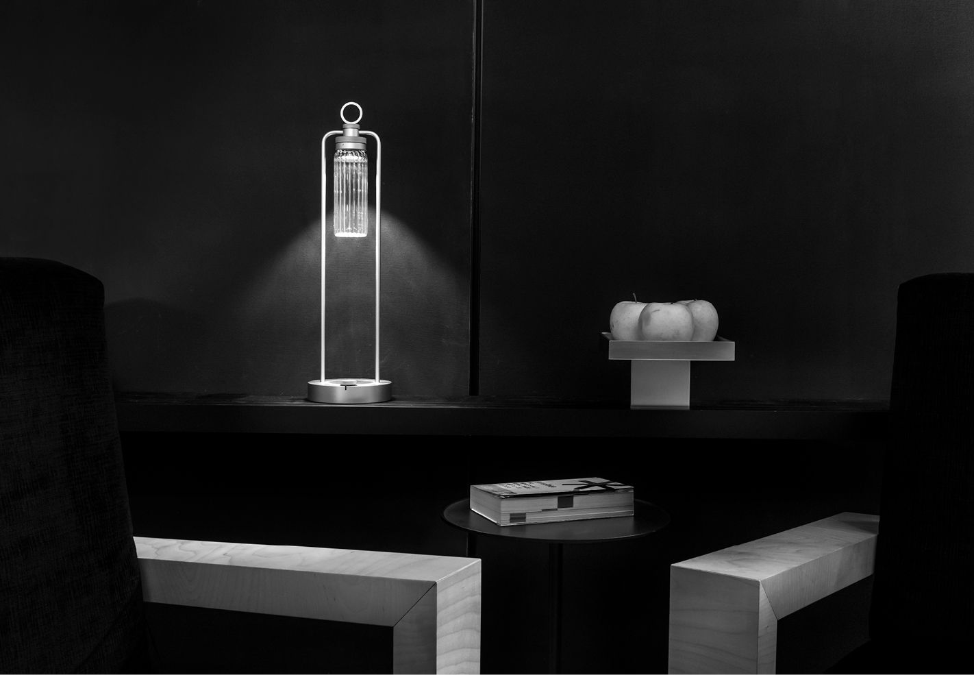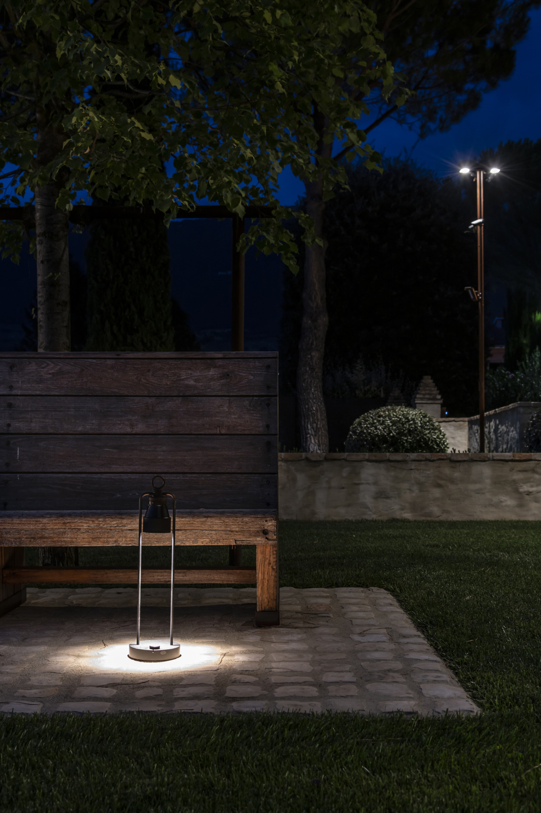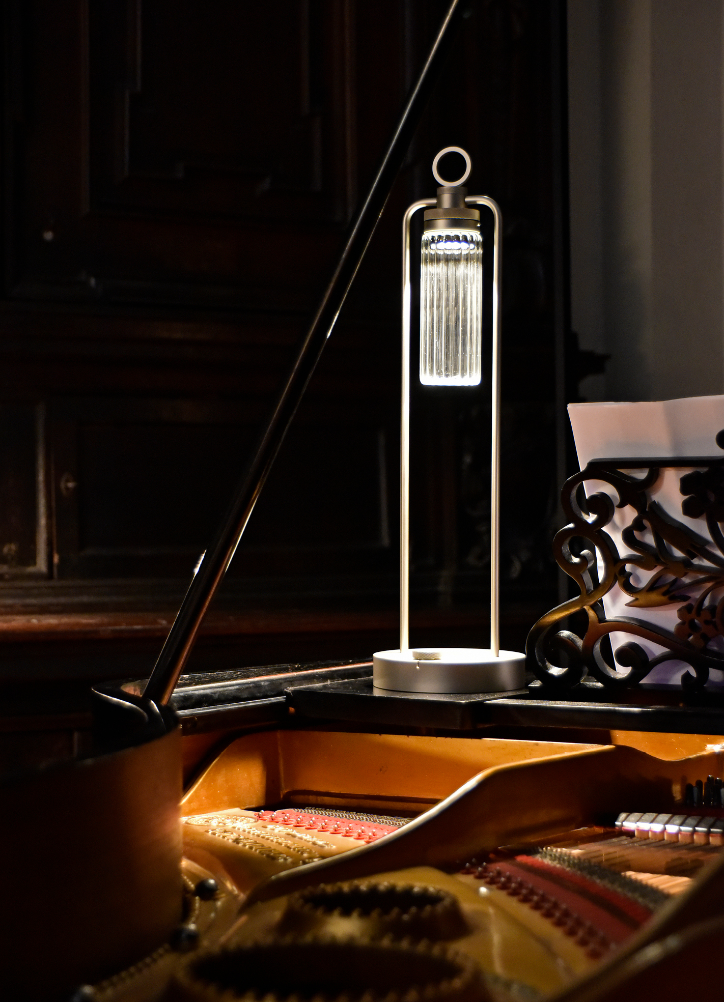 IP20 rated portable and rechargeable light fitting for indoor use. made of oxidised aluminium, with a Ø150mm base in which the battery is installed and on which two h.529mm rigid rods are installed; the rods support n55 system heat sink that rotates by 180° on the horizontal axis. wired with 2700K 3.9W 355lm led source. available with dc01, dc02, kk01 and ajp01 decorative diffuser for diffused light or spot55x61 15° and spot82x79 37° technical diffuser. any irregularities in the glass are a guarantee of an unique product, blown and entirely hand crafted by master glassmakers. 10 hours battery life, 12 hours recharge time, 100-240V/20V usb-c power supply with plug included, wall hanging kit. accessories: wall hanging kit. finishes: argento hacca, nero55.