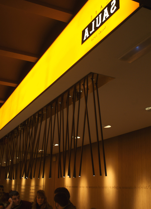 el concepto generador del proyecto es el de trabajar con los materiales y los elementos tradicionales del espacio bar/cafetería para hacerlo entonces evolucionar y modernizarse a través de un nuevo uso de los materiales (mármol blanco, madera, chapa negra). el otro pilar importante del proyecto es el concepto de espacialidad, obtenido y calibrado con el uso de la luz y de los espejos. el estudio de los acabados es meticuloso, y la composición entre los materiales es el alma misma del espacio: suelos en chapa de hierro negro, revestimiento de las paredes/repisas en bambú macizo, barra del bar en mármol blanco país. en la zona de la barra se ha querido preservar el techo alto con vigas preexistente. el elemento que destaca en todo el local es el gran espejo, que contribuye a aumentar el sentido de amplitud del espacio y que crea un juego de reflejos con el logotipo y los colores institucionales del café saula (en el rótulo luminoso del frente) y al mismo tiempo con el panel gráfico de la lista de productos ofrecidos. la zona dedicada a los clientes se caracteriza por un techo blanco más bajo. en la pared, forrada de madera de bambú, se ha grabado una frase en relación con el mundo del café. en el centro del local resalta la gran barra monolítica de mármol blanco, iluminada con la lámpara en suspensión peled, un proyecto que el estudio arola ha desarrollado y realizado junto con Viabizzuno.