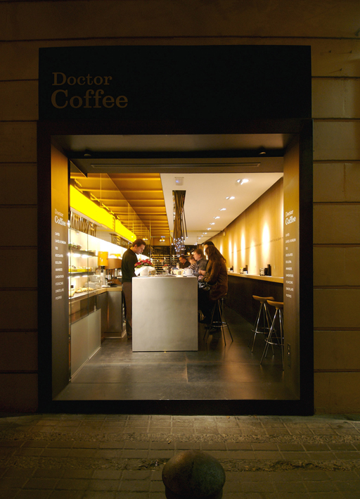 doctor coffee nace de una idea del café saula. se trata de una cafetería moderna y de ambiente en la que se desea mantener la tradición del degustar un buen café, tal vez acompañado con las especialidades culinarias frescas del día.