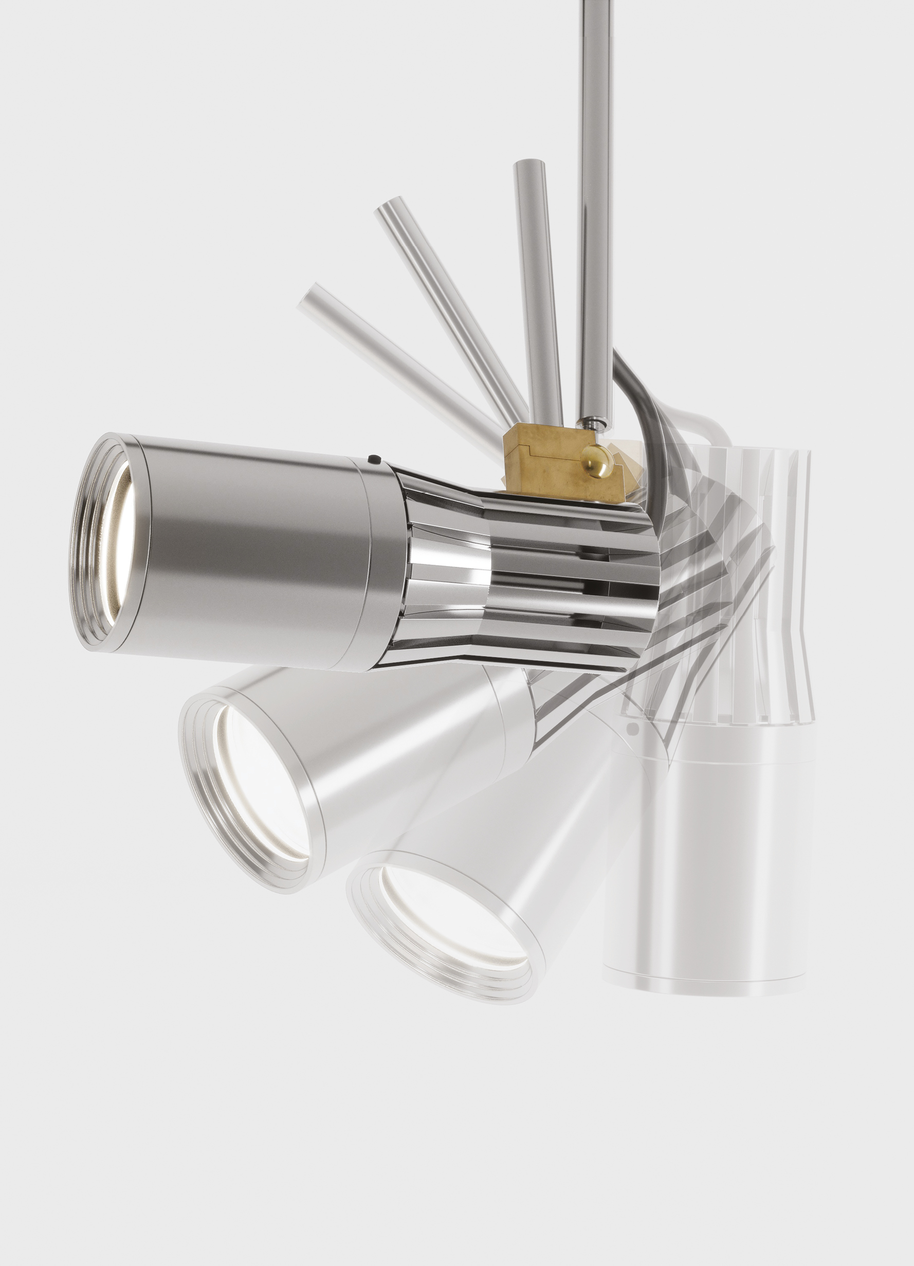 realizzato in alluminio con snodo sferico in ottone naturale. orientabile su tre assi, rotazione sull’asse verticale di 360°, e maniglia che ne permette un’agevole orientabilità.