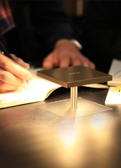 the lamp is operated by touch: by pressing the plate flush with the supporting surface, the lamp rises by 147mm and the light switches on. when the lamp rises, a plate becomes flush with the table surface.