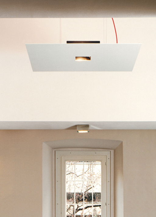 luminaire à suspension pour intérieurs IP20 constitué d’un boîtier verni noir et d’une plaque vernie blanche ou noire, en aluminium brillant ou en placoplâtre (990x990mm). le boîtier contient les câblages, disponibles dans trois versions différentes: pour iodures métalliques RX7s 2x70W, pour lampes halogènes linéaires R7s-114 2x300W, ou pour fluo 2G11 4x55W. fourni avec câble d’alimentation en tissu rouge, longeur 3000mm. m7 sospensione contient deux rails 12V qui permettent l’installation de 3 kits dichroïques orientables GU5,3 de 50W ou led GU5,3. sur demande est disponible la rosace.