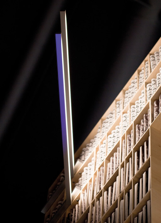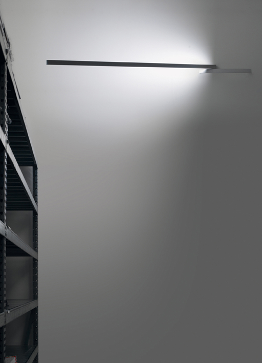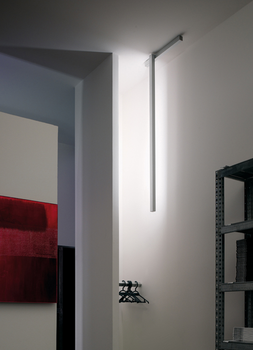 corps d'éclairage pour intérieur IP20 en aluminium extrudé oxydé argent opaque composé des éléments suivants: profil c2 fixé au mur pour loger l'alimentateur (406–506mm) qui soutient un profil c2 (630mm, ou 930mm, ou 1230mm, ou 1530mm) câblé respectivement pour les ampoules fluorescentes G5 14W, 21W, 28W, 35W. un axe entre les deux éléments permet d'orienter la lumière. versions lumière rasante et lumière frontale disponibles.