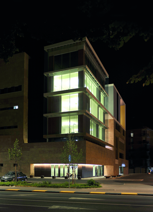 le bloc de gauche abrite le nouveau siège du quotidien de mantoue, la gazzetta di mantova. le plus ancien quotidien italien fondé à mantoue en 1664. le plan, conçu sur la base de critères de flexibilité, prévoit un noyau central, avec escaliers et ascenseurs, qui relie directement au premier niveau du sous-sol, celui du parking. à ce bloc de distribution, à hauteur du front Nord, sont situés les archives et les sanitaires. du rez-de-chaussée au cinquième étage l'organisation des espaces est assurée par des aménagements fixes et mobiles. le seul élément conçu est la salle de réunion, au premier étage, agencée autour d'un petit atrium de distribution. une boîte de verre souligne la présence de la rédaction qui, active la nuit, illumine comme une lanterne l'entrée de la ville.
